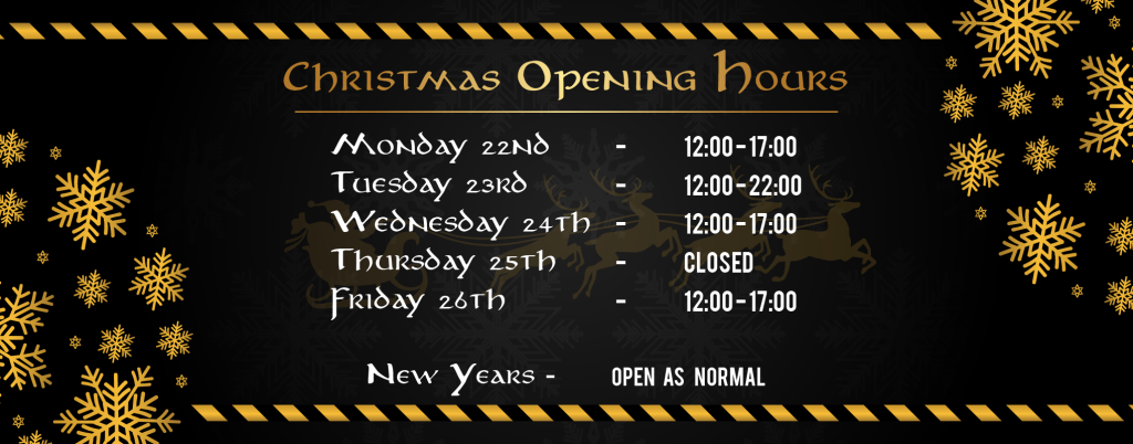 So here’s our Christmas opening hours, just closed on Christmas day, with some early closes in the surrounding days, so just be aware if you’re planning gaming days out during your time off over the festive period!