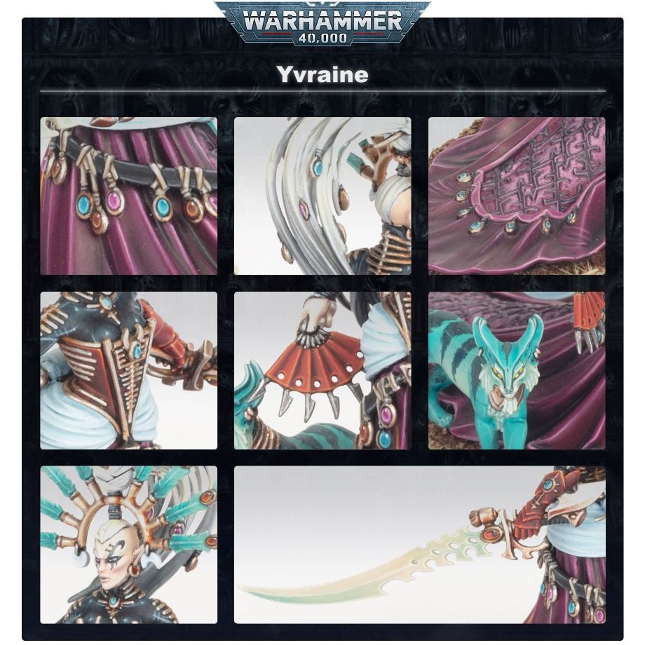 This kit builds Yvraine and her Gyrinx familiar. Formidable in combat and an exemplary psyker, her poise and grace mask her merciless nature in battle. When her allies fall, she gains strength from them, thanks to her pact with Ynnead, the Aeldari God of the Dead.