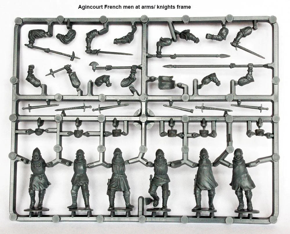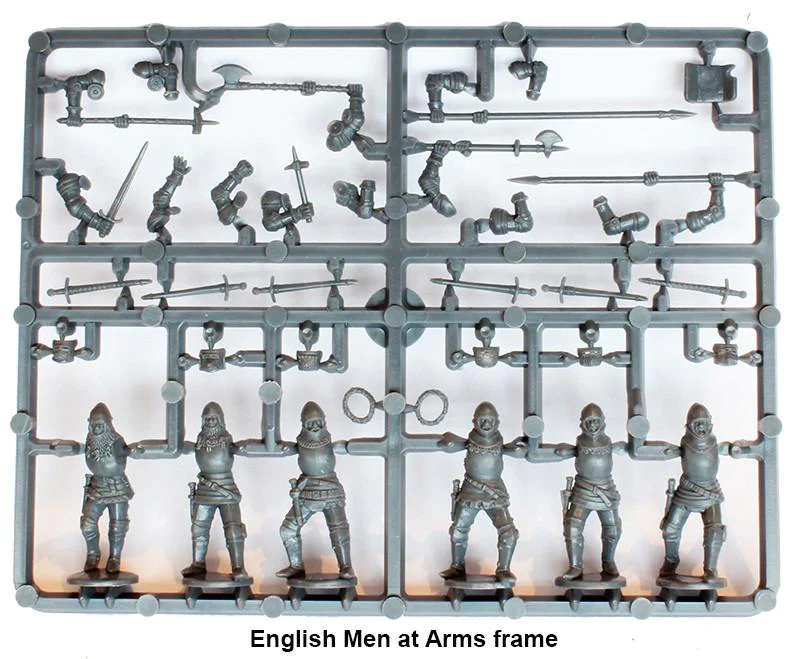 This box contains 36 plastic Knights/Men at Arms. There 18 ‘English’ knights and 18 ‘French’, however all could be used for the same side or any West European nation. They are armed with cut-down lances/spears, pole arms and swords.
