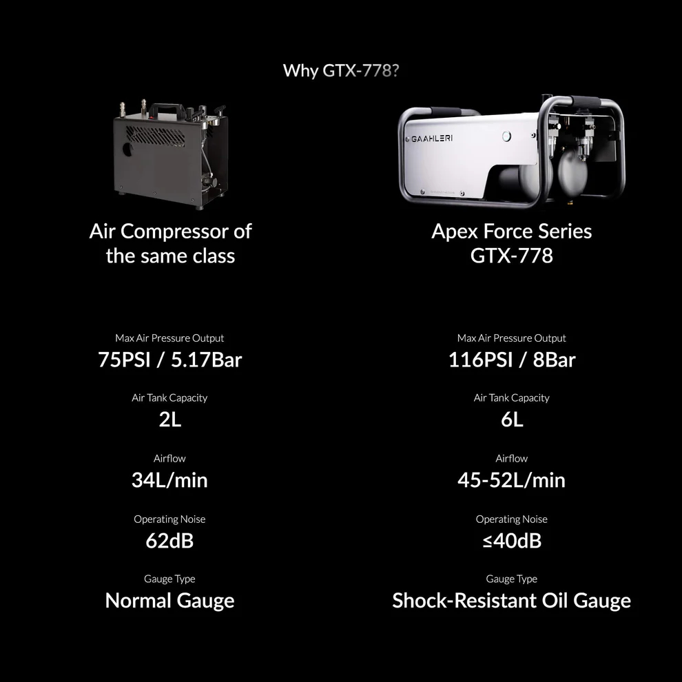 The GTX-778 from Gaahleri’s Apex Force Series is an ultra-silent semi-industrial air compressor engineered for creators who demand both performance and elegance. Designed with advanced functionality and quiet operation in mind, this powerful machine redefines what’s possible for your studio.