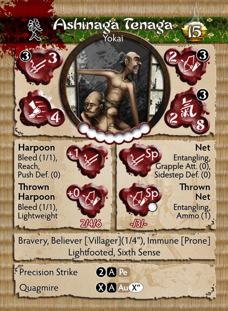 Ashinaga Tenagis are usually sited in streams or rivers and it seems that they have a deep connection with the water, able to commune with the water around them to turn the land into a sea of mud. These yokai, long a legend amongst the peasants of the Ro-Kan, exact motivations for joining the fray are unknown but they are a welcome boost to the morale of the villagers they appear to protect, their presence imbuing a sense of belief in the common people enabling them to fight harder in defence of the balance of Jwar. To look at them individually one would think that they lack any combat skill, but once combined, one astride the other, the pair are a tricky opponent. With a snaring net in one hand which they use to either entangle an enemy up close or from afar, in the other a diamond sharp fishing spear handled with great precision.