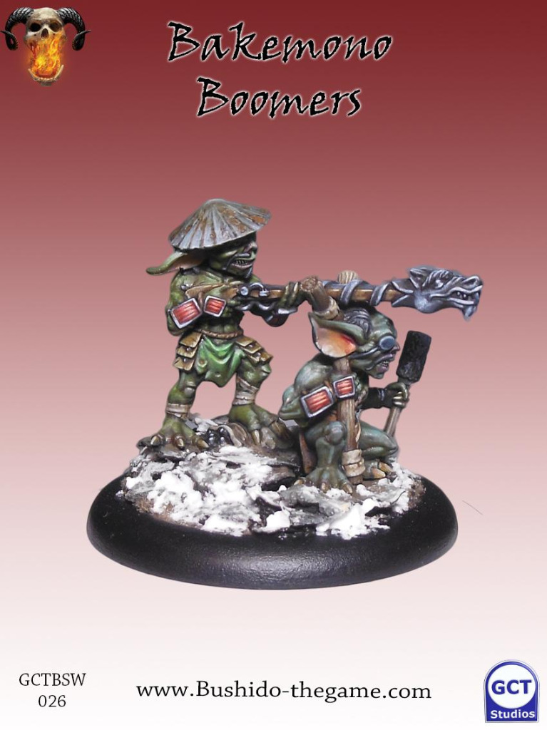 A lot could be said for the subterranean races’ savage and cruel practices however their ability to adapt and change based on the environment and resources available cannot be ignored, their resourcefulness is something to be admired when considering the scarcity of materials offered in the dark places they claim as their own. Now with the world in turmoil, ravaged by war, the bakemono tribes pick the battlefields clean like maggots at a wound. This has led to the advancements of the Prefecture being turned against them. The boomers are one such example of this, two brave and possibly a little stupid bakemono eagerly working the famous ryu arquebus to deadly effect.