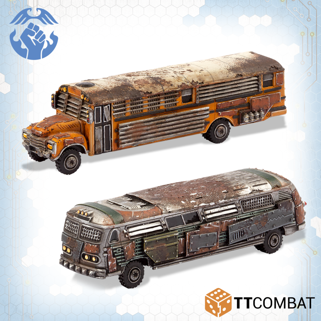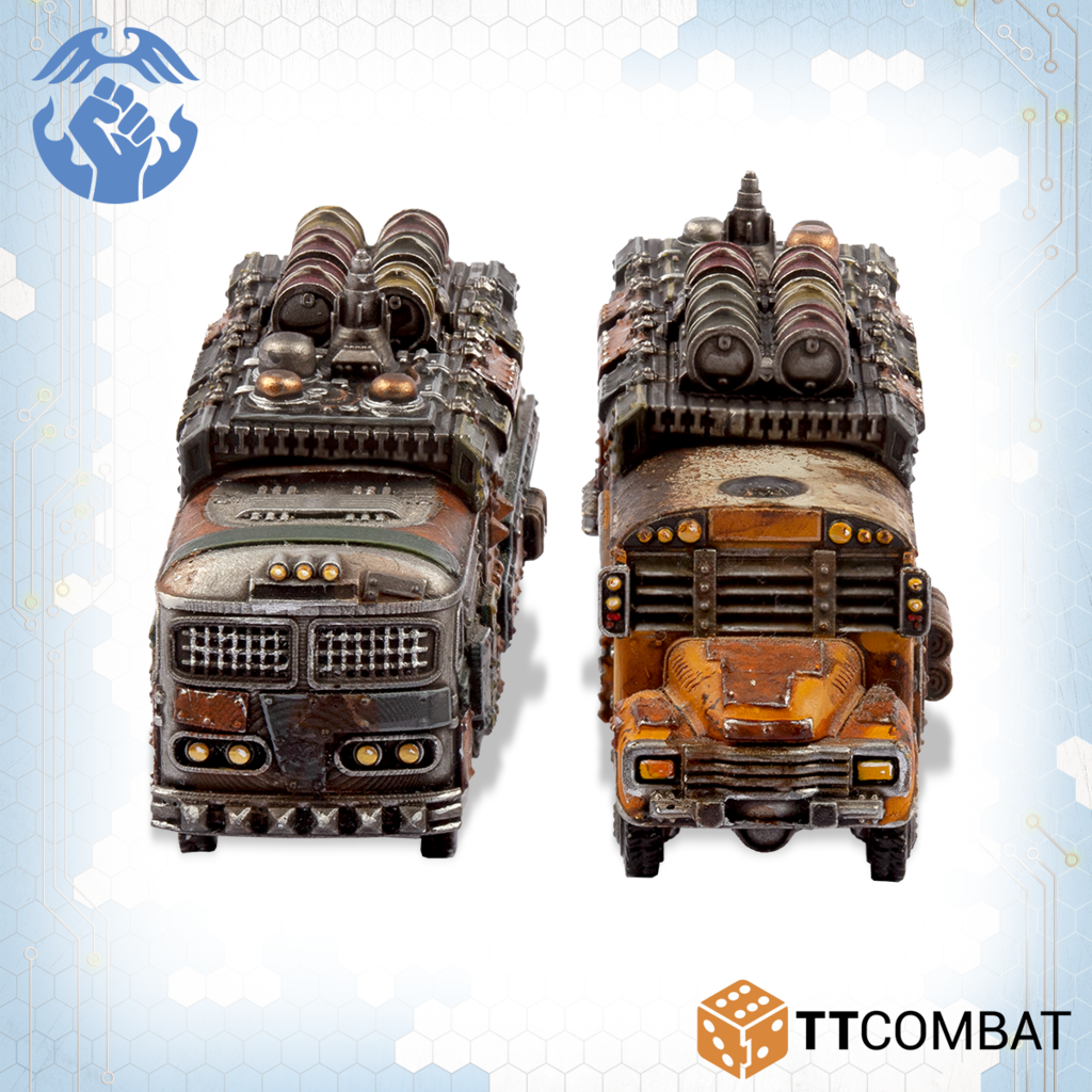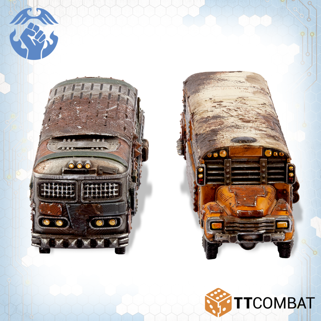 Contains 2 resin miniatures with the choices to make both as Battle Buses or Remote Bomb Buses. Also contains parts to upgrade the Battle Buses with Rocket Launcher Batteries or Heavy Machine Gun Batteries. These miniatures are highly detailed, approximately 60mm in length.