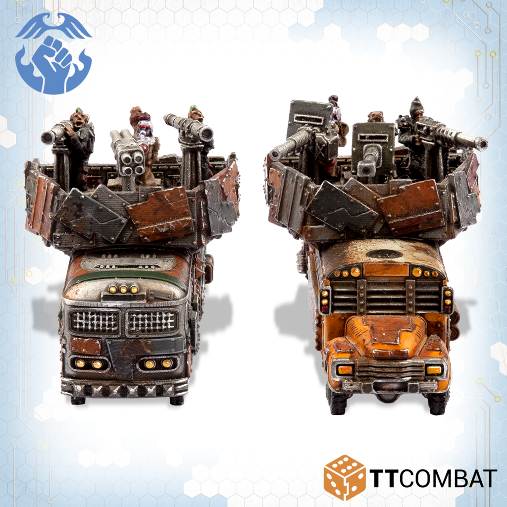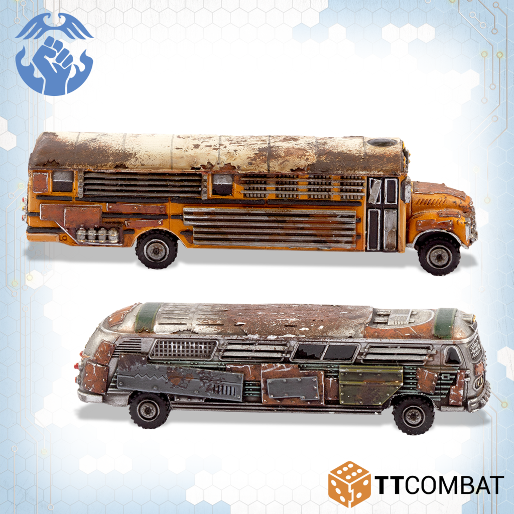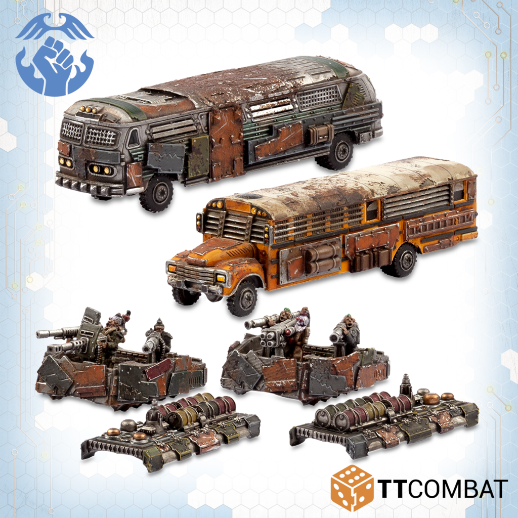 Contains 2 resin miniatures with the choices to make both as Battle Buses or Remote Bomb Buses. Also contains parts to upgrade the Battle Buses with Rocket Launcher Batteries or Heavy Machine Gun Batteries. These miniatures are highly detailed, approximately 60mm in length.