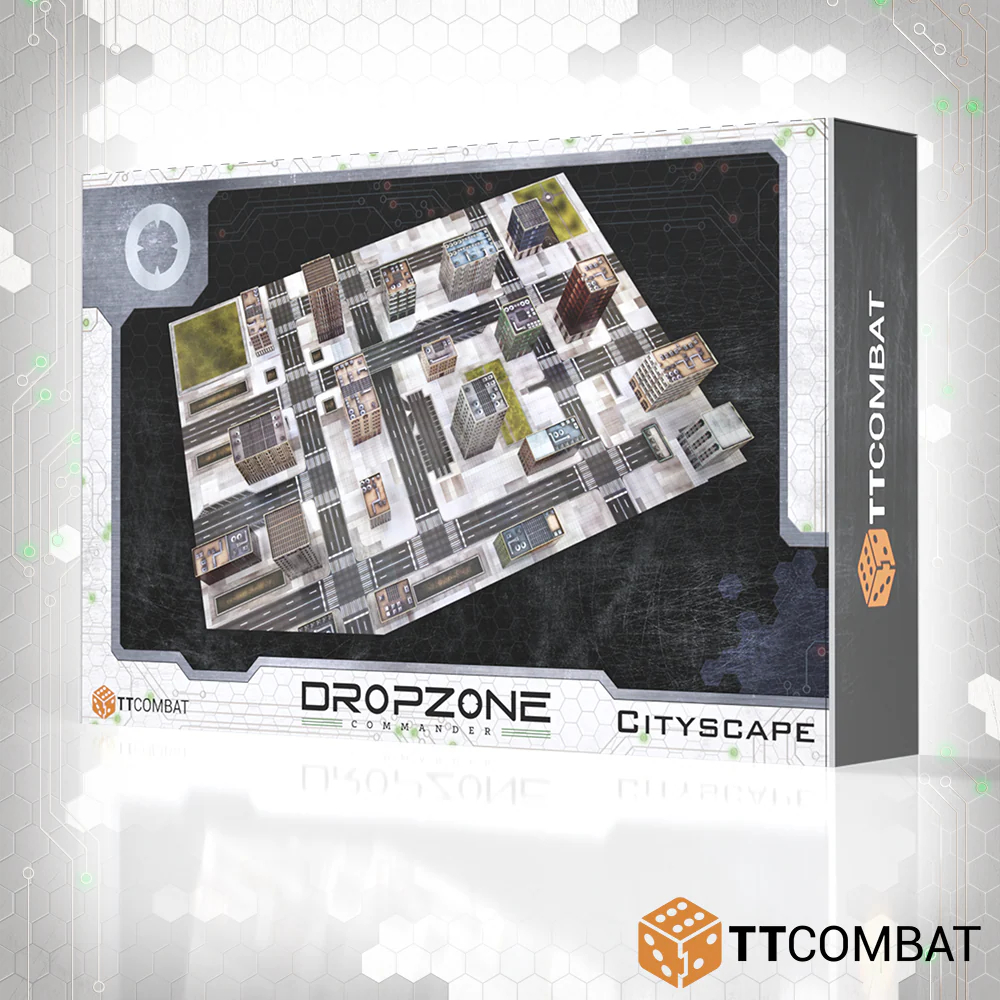 The Cityscape is a customisable battlefield in a box. One contains all of the scenery you’ll need to get started with Dropzone Commander, making a 6’x4′ gaming space. The buildings and mats are designed to look clean and fresh, maybe even a Colony World that is being attacked by alien foes.