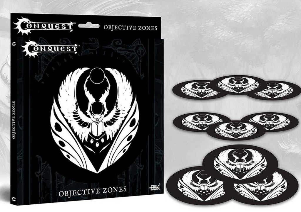This is a set of 9 Objective Zones in Black with the White Weaver Courts Faction Logo that brings more Conquest look and feel to your table. A new and unique material that won’t slip on the table, but will allow your models to easily slide over, off and around, these are ultra thin made of .5mm polypropylene. Great for any wargame play. Three 9″ Zones and Six 6″ Zones packaged together. Made in the EU.