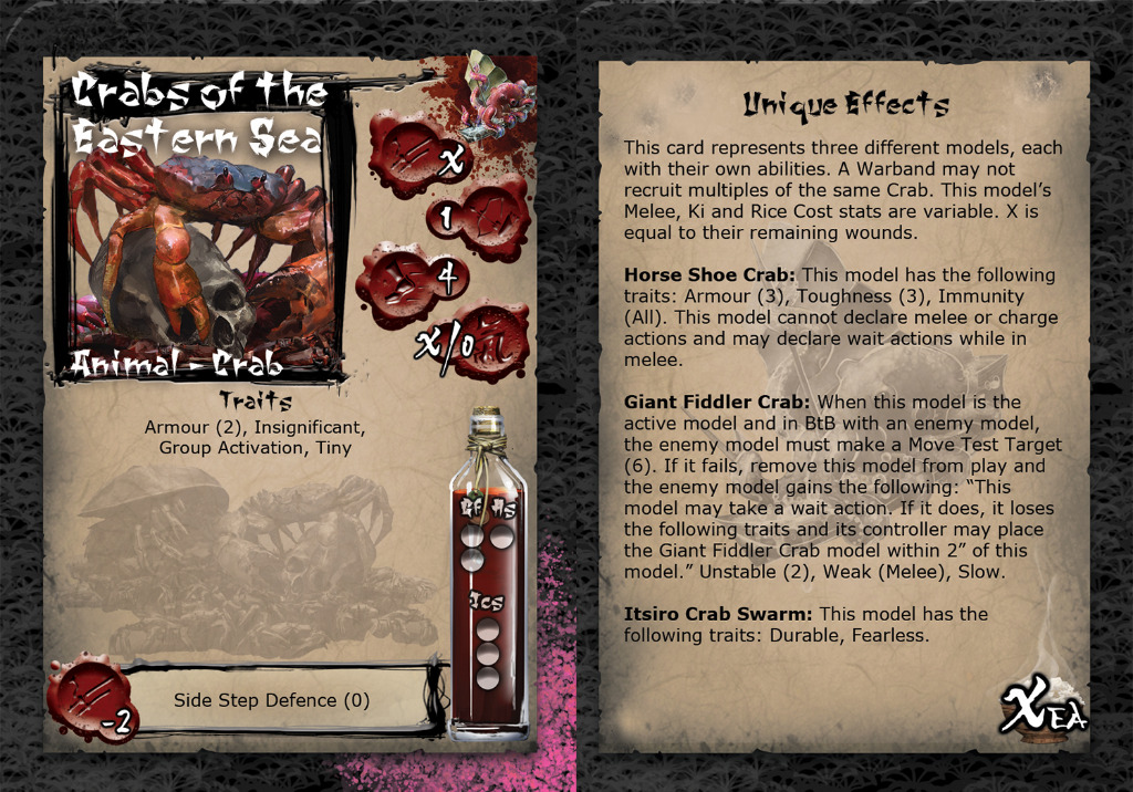 With three different types and with low Rice Costs, I expect to see some of these in many lists. With the Swarms resilience and actually high Melee Skill, the fiddler Crabs huge claw that can grab hold of an opponent and cause him to suffer The Unstable, Weak and Slow traits, making that model easy prey for a pirate in melee or the Horse Shoe Crab’s amazing Armour (3), Toughness (3) and Immunity (All) making it almost impossible to shift from a scenario point; each crab offers something different and may be just what you need to round out your list.