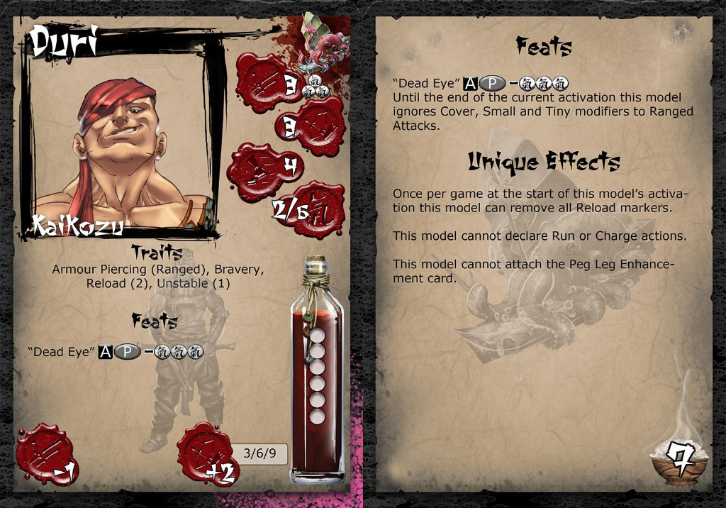 He is almost as good a shot as he boasts and with his two “ladies” by his side, a threat to even the most nimble monk or heavily armour samurai, making him a legend amongst the Jung. The tale of how he lost his leg a source of much amusement amongst his peers.