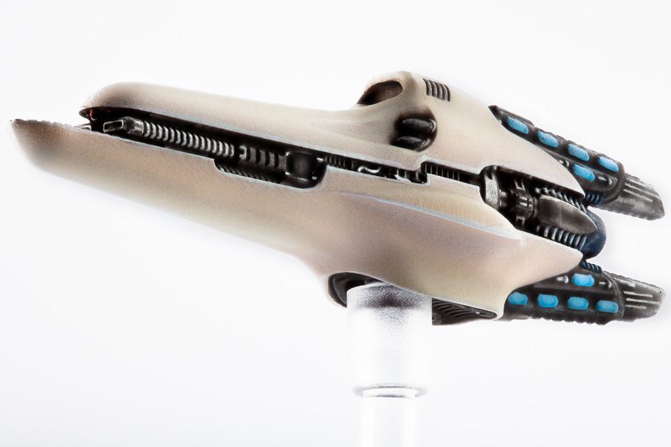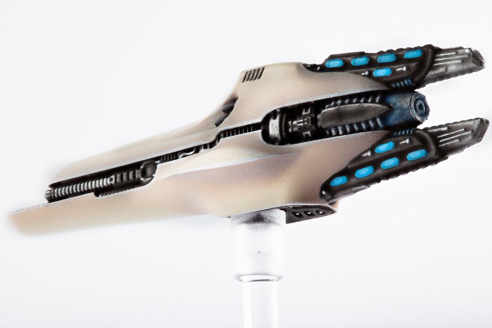 The Echo class corvette is a small, atmospheric-capable vessel of sub-frigate tonnage designed to prow the atmosphere for vulnerable prey, such as strike carriers. Armed with a heavy missile payload, the Echo is adept at decimating the larger targets which it hunts. It is also armed with a pair of mass drivers buried within its streamlined hull, making it a threat to enemy ships at range when fighting in the void. In combination, this makes the Echo more heavily armed than any equivalent ship of another race.