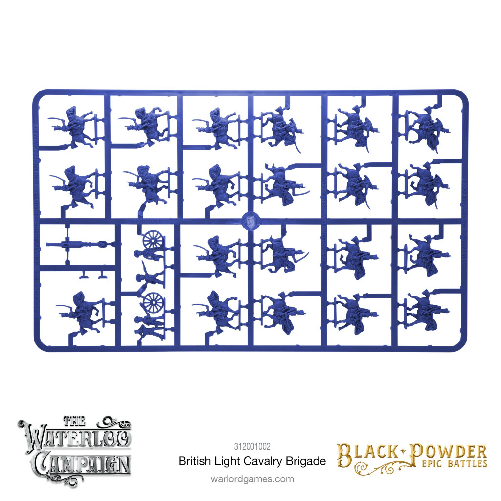 This plastic set provides enough models to field a complete brigade of three British light cavalry regiments (3 bases of Hussars in shako, 3 bases of Hussars in busby and 5 bases of Light Dragoons) and a 3-gun battery of Royal Horse Artillery 9-pdrs.