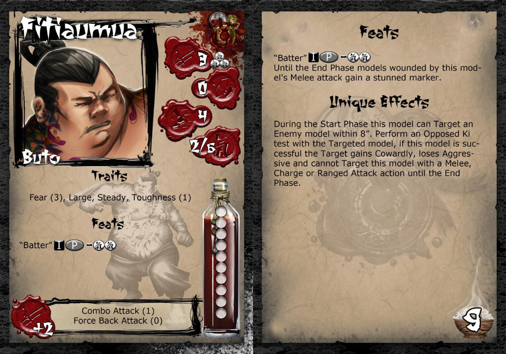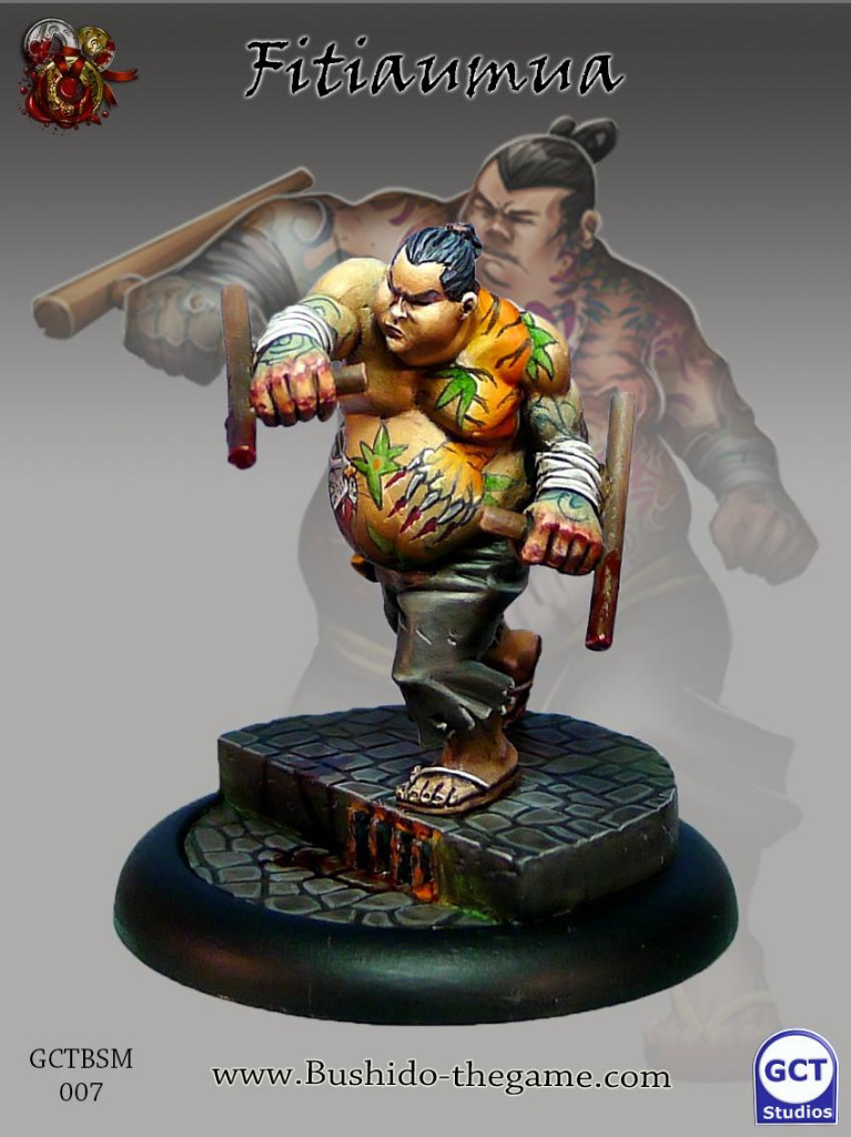 The Buto are a fearsome and brutal people when stirred to actions. Fituamua is no different and serves as the silent enforcer for the Syndicate. A once renowned Jumo fighter he has since worked his way into the service of the Iron Fist gumis. It makes no matter to him if the debt is a single half bronze moon to a thousand Gold ones. If his Oyabun gives him a name he will collect and those who hear the slow knock of his heavy tonfa on their door had better clear the debt or Fitiuamua will gladly give them a lesson in repayment.