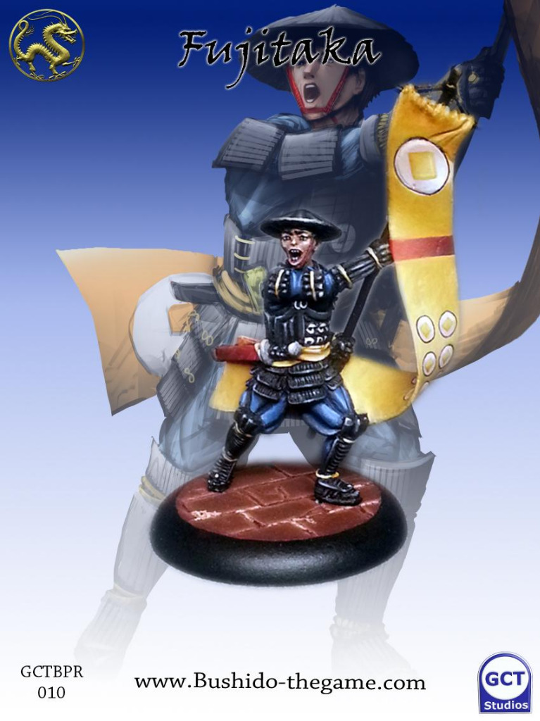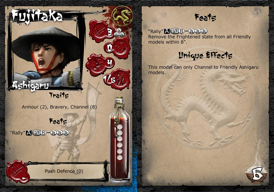 When the tide of the battle is changing and the will of the Prefecture’s soldiers is waning, Fujitaka is there waving his banner and rallying the troops. His bravery in the face of impossible odds is well known and his fellow Ashigaru find their own inner strength in his presence. Fujitaka also shares his own strength to enable others to continue the good fight.