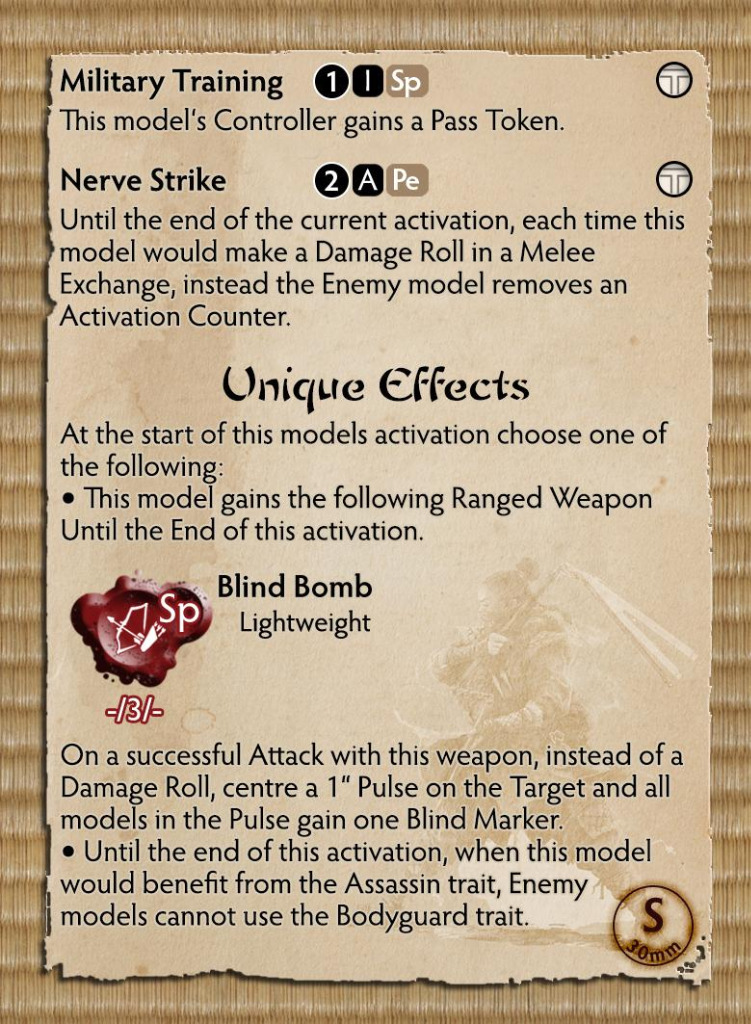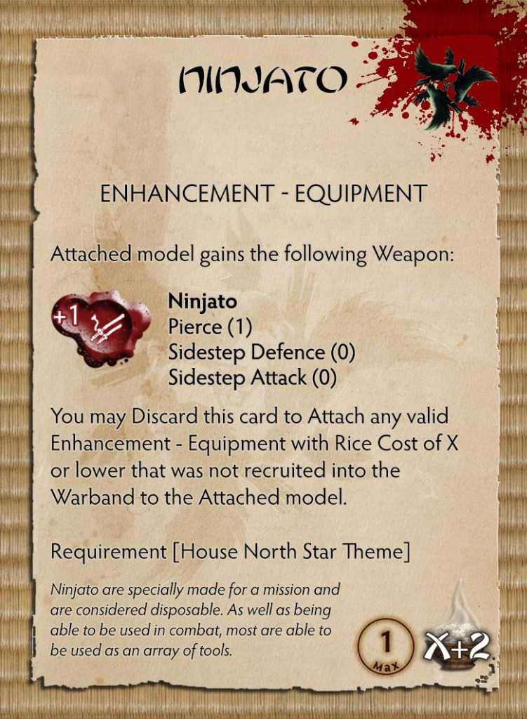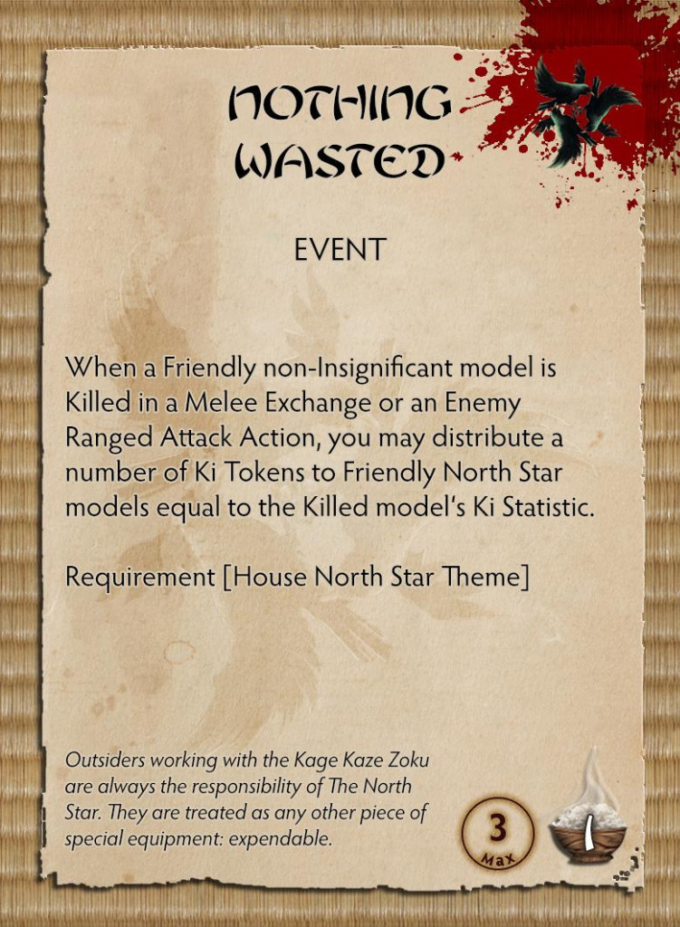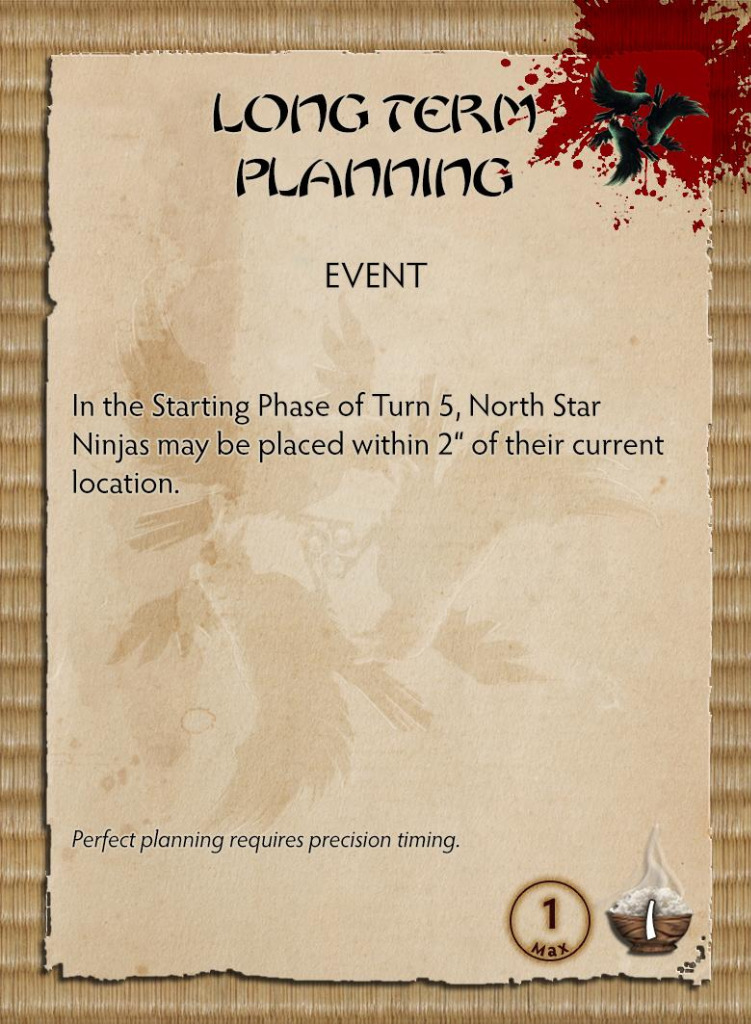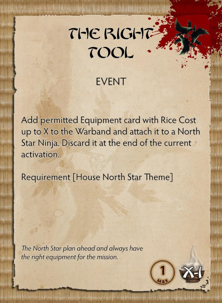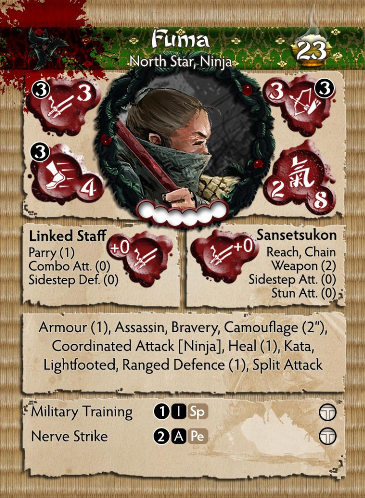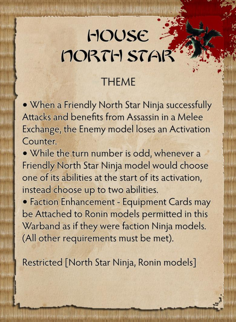 With two weapon options, built-in Blind Bombs, Activation Removal and great melee options, Fuma will be an excellent toolbox for any Ninja Warband exemplifying the North Star way. In addition, Fuma comes packed with the North Star Theme card offering a whole new playstyle for the House that prepares for any eventuality.