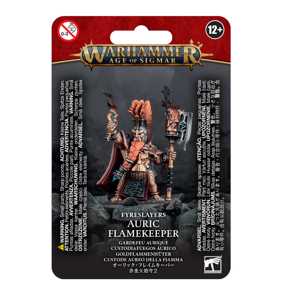 This multipart plastic kit builds one Auric Flamekeeper, a funerary support Hero and Totem for Fyreslayer armies. Garbed in his sacred salamander-skin cloak and stern death mask, this duardin bears aloft the burning Masterflame Rune in one hand and wields a flaming brazier axe in the other. In battle, these warrior-priests wade into combat wherever the fighting is hardest, calling on the ur-gold power harvested from their fallen comrades to activate one of a range of magical effects.