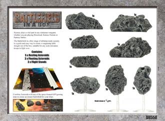 Contains 5 Resting Asteroids, 3 Floating Asteroids and 3 Flight Stands. Combine with and of the space themed GF9 gaming mats to create an instant battlefield for your ships.