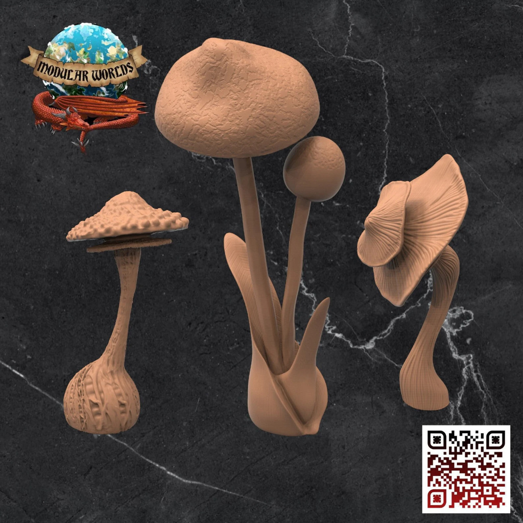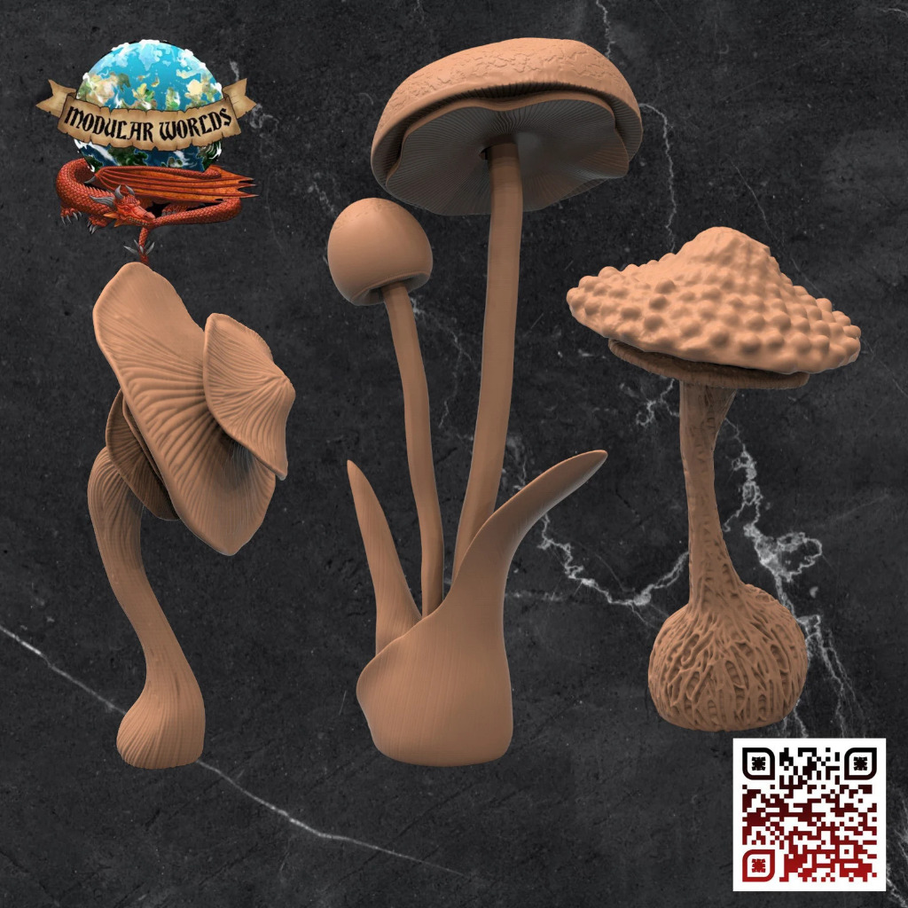 This 6 pack of mushrooms come with3 x variants. They are suited to 28-32mm tabletop miniature games. 3D printed in resin, these miniatures will require some assembly before painting.