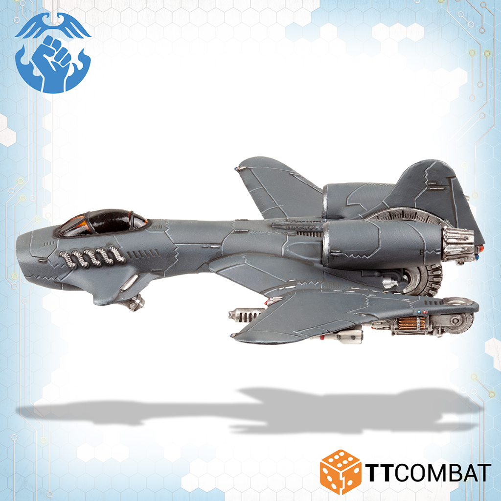 The J19 Hellhog is a truly dangerous heavy strike jumpjet, designed primarily for the ground attack role. It is one of the only fighters operated by the Resistance as its VTOL (vertical take-off and landing) capabilities have allowed it to operate from small, concealed bases far from any serviceable runway. Its excellent weather proofing allows it to continue functioning even in the most oppressive environments; from icy caves to fetid swamps. Coupled with its respectable range, the Hellhog can strike almost anywhere, from almost anywhere. Such capabilities make the J19 superb for supporting an insurgency although ironically they made it suffer during the Scourge invasion. It has a low cruise speed due to the heavy VTOL system and its pilots were poorly drilled at the time. As a result, most were destroyed on the ground or picked off by faster Scourge Corsairs. Although it can be equipped with air-to-air missiles, it has always had a lacklustre record in dogfights.