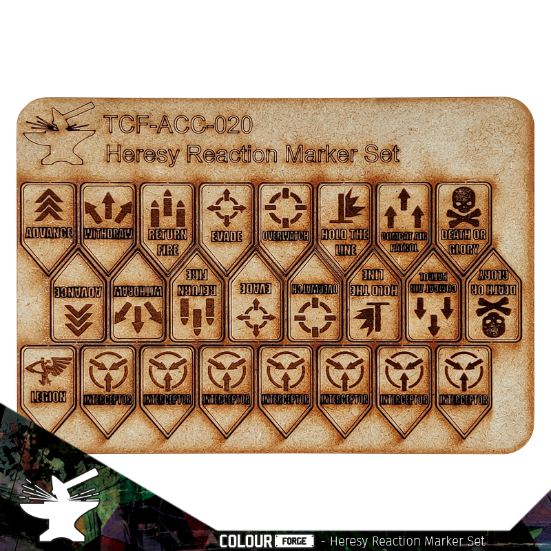 The Heresy Reaction Marker Set from the Colour Forge is the perfect addition to any of your heretical shenanigans on the gaming table! Made from precision laser cut 3mm MDF, this set of tokens will be indispensable in helping you track all of those different reactions that occur in game. The Heresy Reaction Marker Set comprises :-