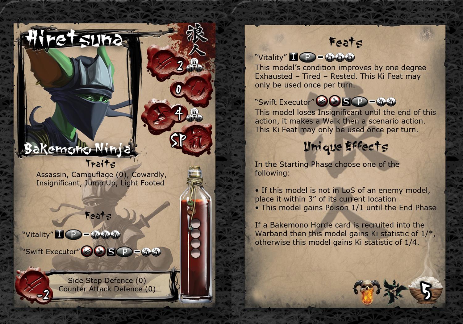 Hiretsuna is an oddity amongst the Bakemono, selected by the Council of Shadows at a young age and marked for greatness. The Council have invested heavily in Hiretsuna and when the Kage Kaze Zoku agreed to train him their plans moved one step forward. His race’s natural affinity for subterfuge combined with his practised skills make him also impossible to stop, he is able to strike with pinpoint accuracy where his opponent can least afford.
