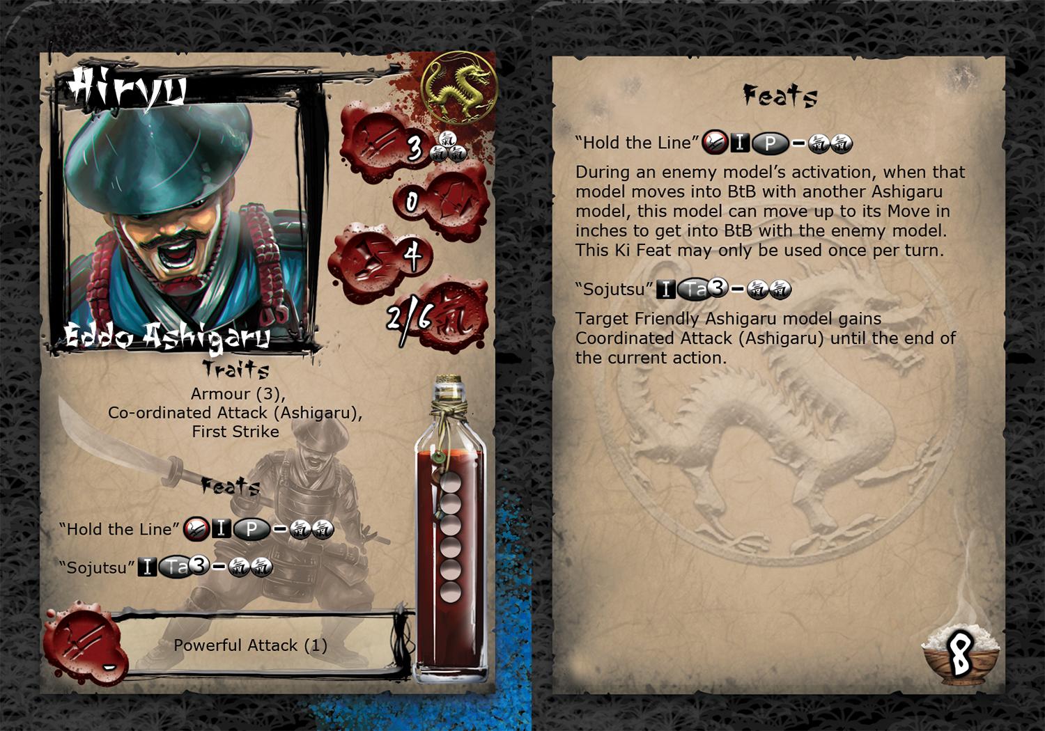 Hiryu is an Ashigaru hailing from the city of Eddo, distinguished from his fellow Ashigaru in Ryu by the heavier armour he wears. He also skilfully wields the Naginata favoured in the North, rather than the Yari; which is standard issue in Ryu. A life long soldier, Hiryu is a firm believer in rank and file fighting. He understands the ebb and flow of the line and is at his best in battle when fighting shoulder to shoulder with his fellow Ashigaru.