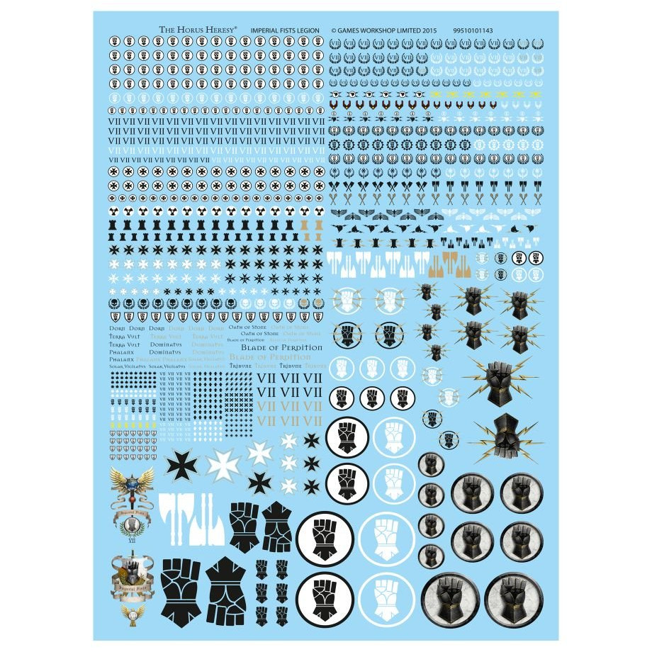 This A4-sized sheet contains 1,075 high-quality, full-colour waterslide transfers – more than enough for all but the largest Legiones Astartes forces. These transfers allow you to easily customise your miniatures with detailed imagery, specifically designed for the Imperial Fists Legion. The sheet features accurate Legion icons and numerals, company markings, and squad designations, as well as a variety of decorative insignias, honours, large vehicle badges, and banner art for your Imperial Fists army – including ornate text decals and formal Terran honour marks.
