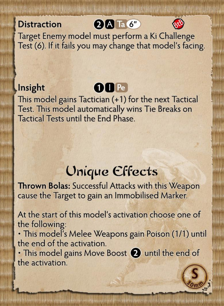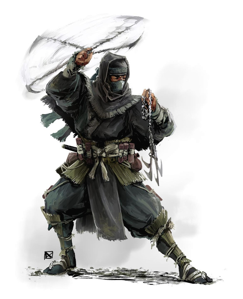 Jinichi is a valuable member of The North Star who adds a slightly different approach to what they do. He has perfected fighting with a strange weapon that is a unique combination of blade and chain, and the whirring sound it makes as he spins it is often the last thing his enemies hear before they die. Because of its reach, it can quickly get between a samurai and his sword, thus breaching his defence leaving him open to attack. The blades are designed to cut and tear the flesh from his enemies bones, while the chain can immobilise the arms or legs of the unwary. Jinichi is no stranger to the poison stores of his night-clad clan, and he incorporates this into his fighting style by anointing his blades with deadly toxins. Jinichi is a lethal killing machine with a penchant for tactics and terror.