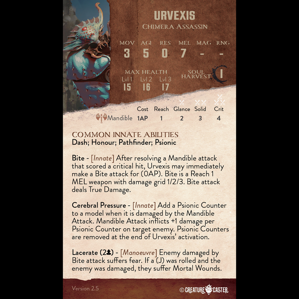 Born from elven manipulation and evolved beyond her intended purpose, Urvexis has mastered her violent heritage to become an unmatched Chimera Assassin serving Torin. Her attacks are swift and lethal, with psychic abilities leaving foes mentally and physically crippled. Able to strike from unexpected angles, her “From Above” teleportation allows precise and devastating assaults that bypass enemy lines.