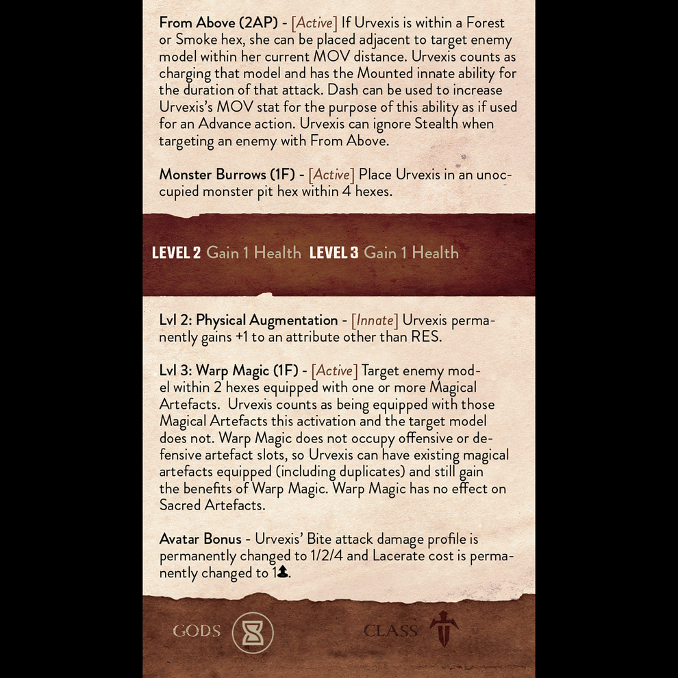 Born from elven manipulation and evolved beyond her intended purpose, Urvexis has mastered her violent heritage to become an unmatched Chimera Assassin serving Torin. Her attacks are swift and lethal, with psychic abilities leaving foes mentally and physically crippled. Able to strike from unexpected angles, her “From Above” teleportation allows precise and devastating assaults that bypass enemy lines.