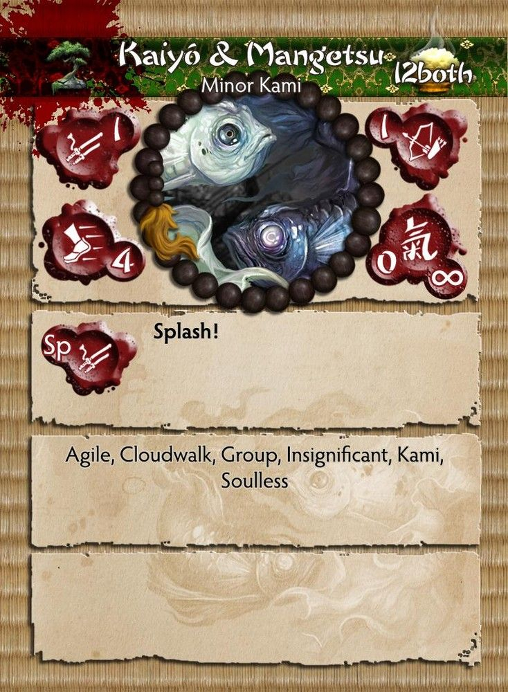 Community and protection are values held dear by the villagers of Jwar, as they are stronger together rather than apart. Kaiyo & Mangetsu represent these stalwart beliefs and the concepts of life, death, salvation or endless torment. They appear as rippling reflections in bodies of water such as ponds, pools, wells and the like. They are a duality spirit, two halves of a whole existing in harmony, just like the temples and the villages of Ro-Kan exist together—a perfect symbol of their reliance on each other.