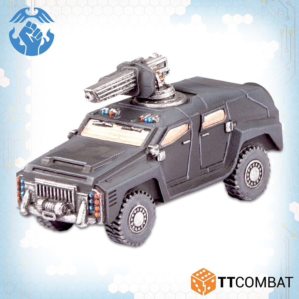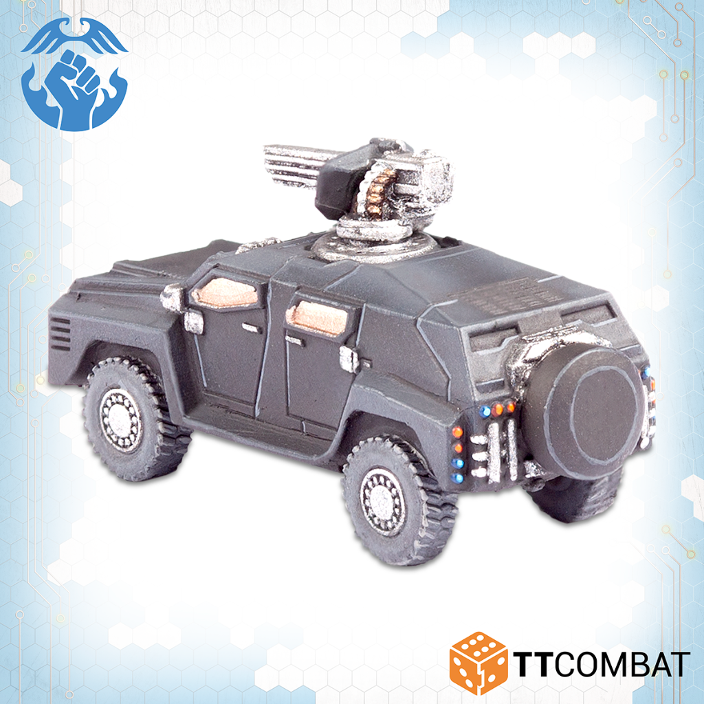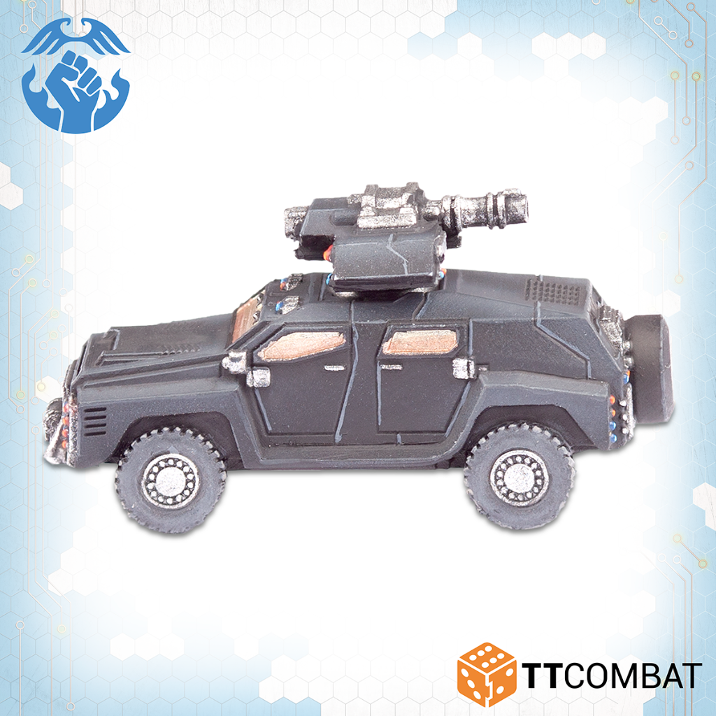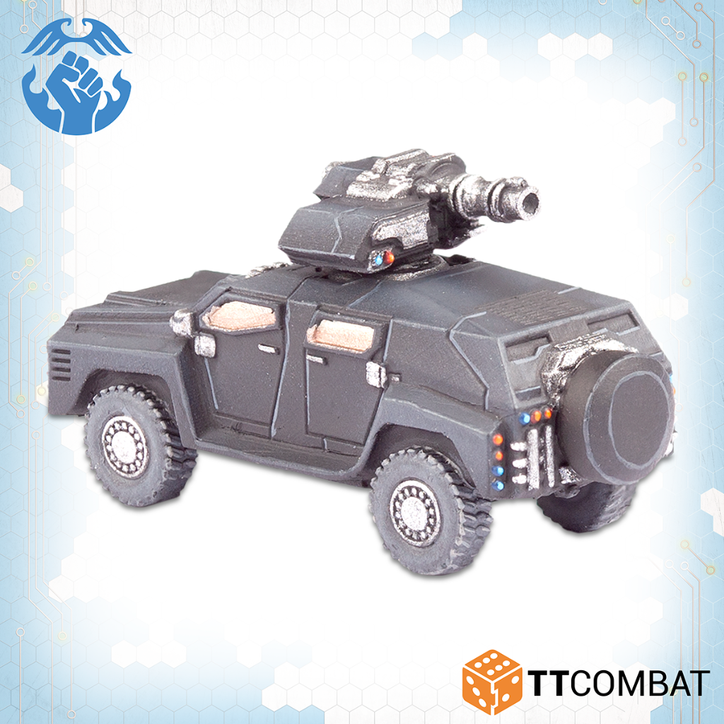 The K12 Combat Utility Vehicle – known by Kalium troops as the ‘Kuv’ – is armoured, car-sized and packs a roof rack turret for an anti-armour missile launcher or AA-capable heavy machinegun. For the average Kalium citizen, the K12’s blocky silhouette is a perpetually visible symbol of the Kabal’s iron grip.