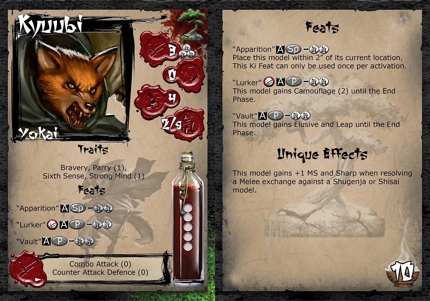 Unlike the female Kitsune the males of this mysterious and seclusive yokai race cannot shapeshift and instead keep the form of an anthropomorphic fox. Kyuubi is a skilled warrior and hunter of those his people feel are to blame for the current imbalance in Jwar. He serves a swift and decisive punishment to those Shisai and Shugenja abusing the spirits for their own ends. Waiting silently in the cover of the foliage before striking like a vengeful spirit against the enemies of the Temple.