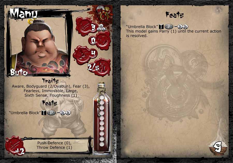 This giant Buto is the personal bodyguard of Harukichi and was selected for obvious reasons. His prowess in the Jumo arenas quickly attracted attention, it was clear to most he was destined for a top position within the Syndicate, and he has not disappointed. Constantly vigilant to any threat, and unshakeable in his devotion to the defence of his Oyabun, Manu has continuously put himself in harm’s way, catching most would be assassins off guard with his prowess in melee, deftly blocking blows until his master is safe, then and only then the time comes to crush bones with fists the size of mallets.