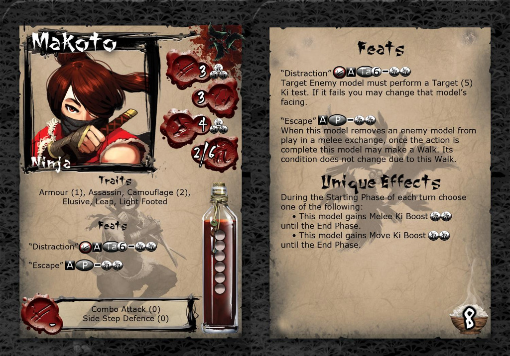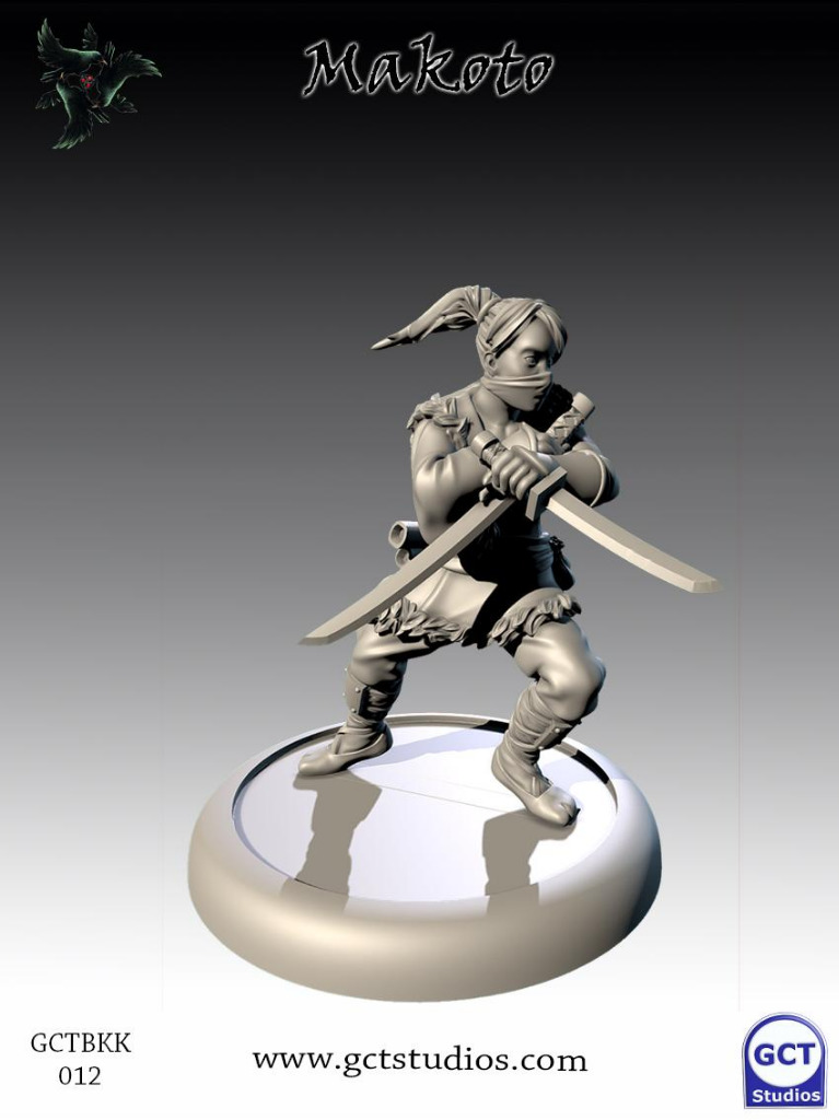 Makoto fights under the house of the bleeding moon for the Shadow Wind Clan. On the battlefield she is everywhere and nowhere at once. Enemies struggle to keep up with her in melee combat and those that try to retaliate amidst her onslaught often find she has already gone. As deadly as she is beautiful, her face is the last thing many will see.
