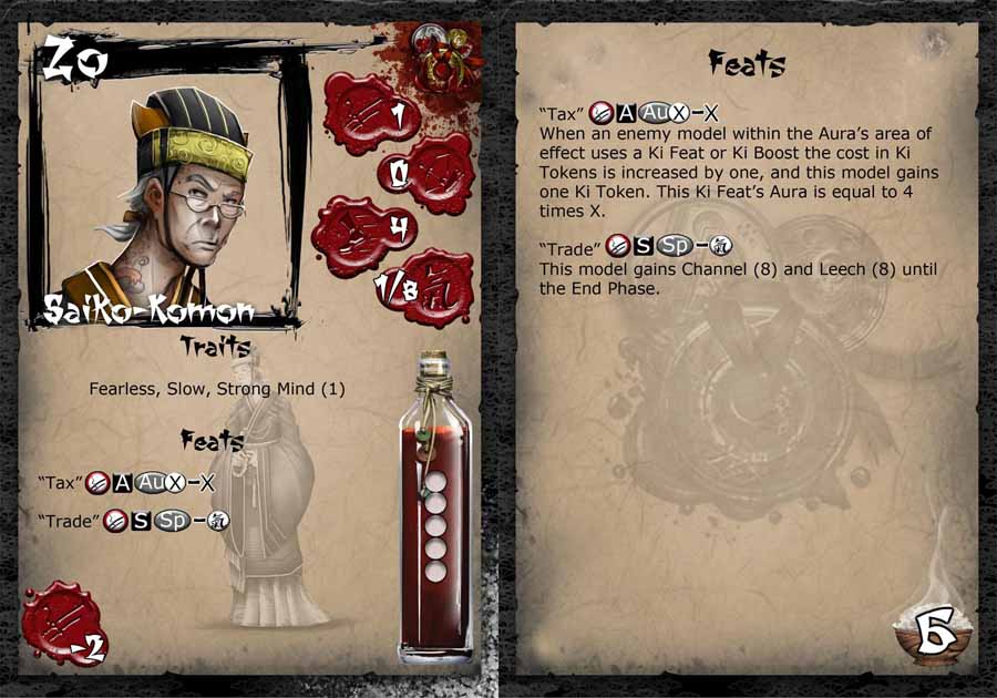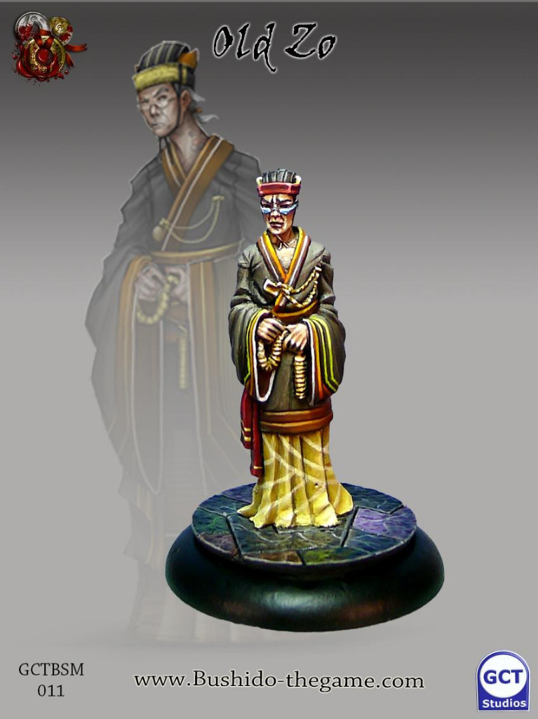 Exactly how Old Zo is remains unknown as it seems he has been in service to the Gumis of the Silvermoon for decades. If the years have taken their toll on his body they have certainly not affected his cunning mind and his famed intellect. Nothing gets past the owl like eyes surveying every situation from behind his rimmed glasses, weighing up the myriad options available. There is nothing that seems to faze this esteemed Saiko-Komon as he quietly manages the ebb and flow of battle, emitting an aura of influence that seems to sap the spark and energy from enemies whilst reinvigorating friends to turn the tide in favour of the Silvermoon. Many Oyabun have felt all the more confident that the odds favour them with Zo by their side.