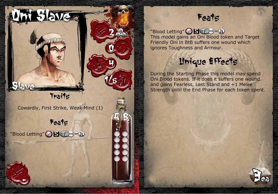 It is unknown when the beasts of the wave started taking captives. These are no hostages though, they are put to work or put to the sword by their less than benign captors. The blood of the Oni sends the slaves into a rage on the battlefield, allowing them to achieve feats of strength they would not have dreamed of back in the fields.