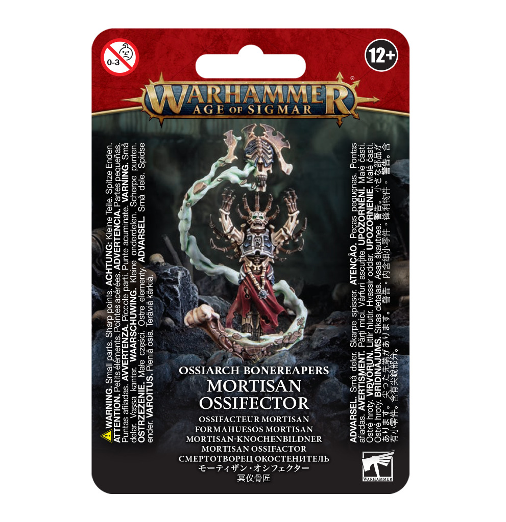 This multipart plastic kit builds a Mortisan Ossifector, an arcane sculptor of mighty bone constructs. This grisly artificer is suspended in a cloud of sorcerous bone-dust, its claws outstretched as it works on a half-assembled Morghast – one of the powerful creations it augments in battle.