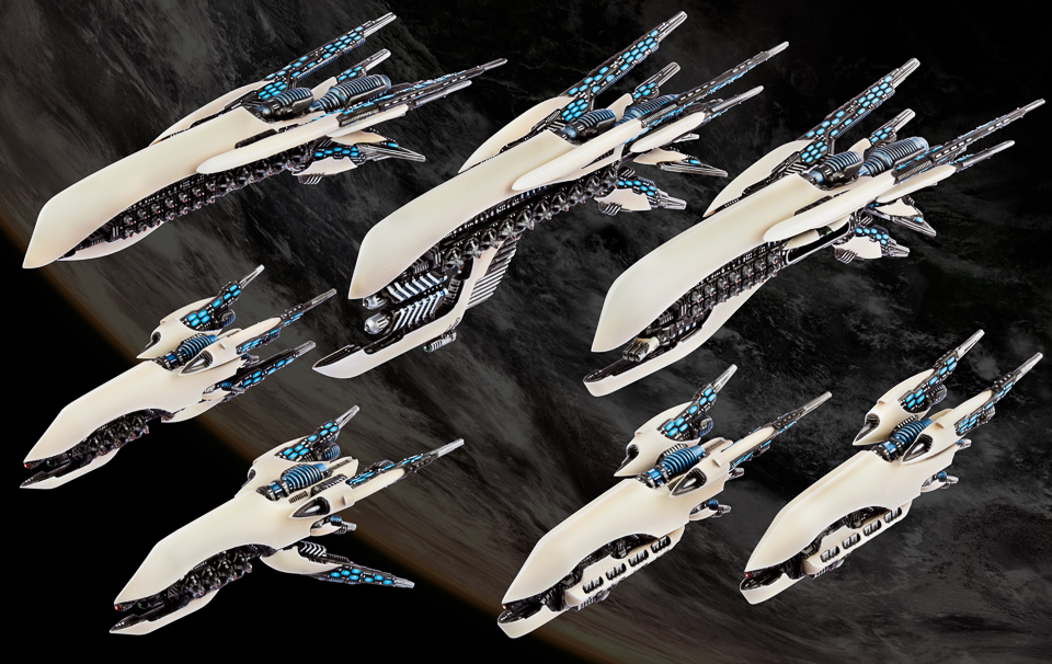 3x PHR Cruisers: These multi-part hard plastic lavishly detailed 1:9150 (0.2mm) scale miniatures can be assembled as up to ten different classes, including cruisers, heavy cruisers, fleet carriers, light cruisers and assault troopships! Typical length 111mm. 49 Parts per ship (including optional ones).