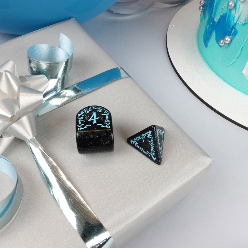 — The background of the dice is shimmering-black (infused with glitter