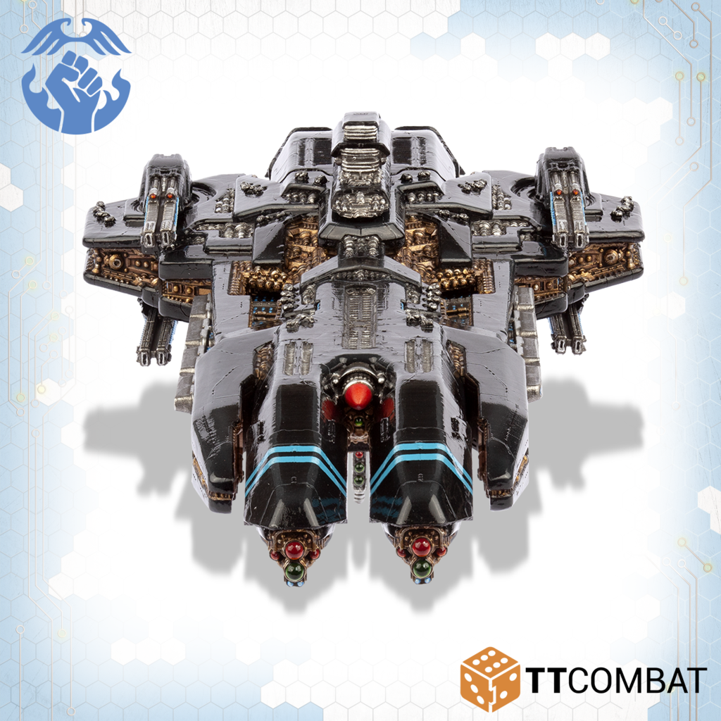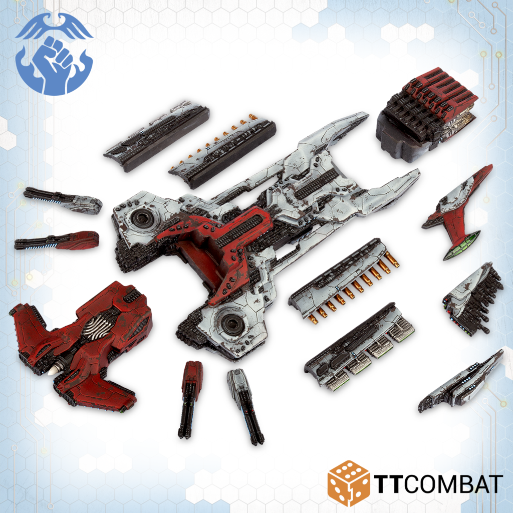 Contains 1 multi-part resin miniature able to be assembled in two variants (with loads of different combinations), and a plastic Dropfleet Commander base and flight stand.