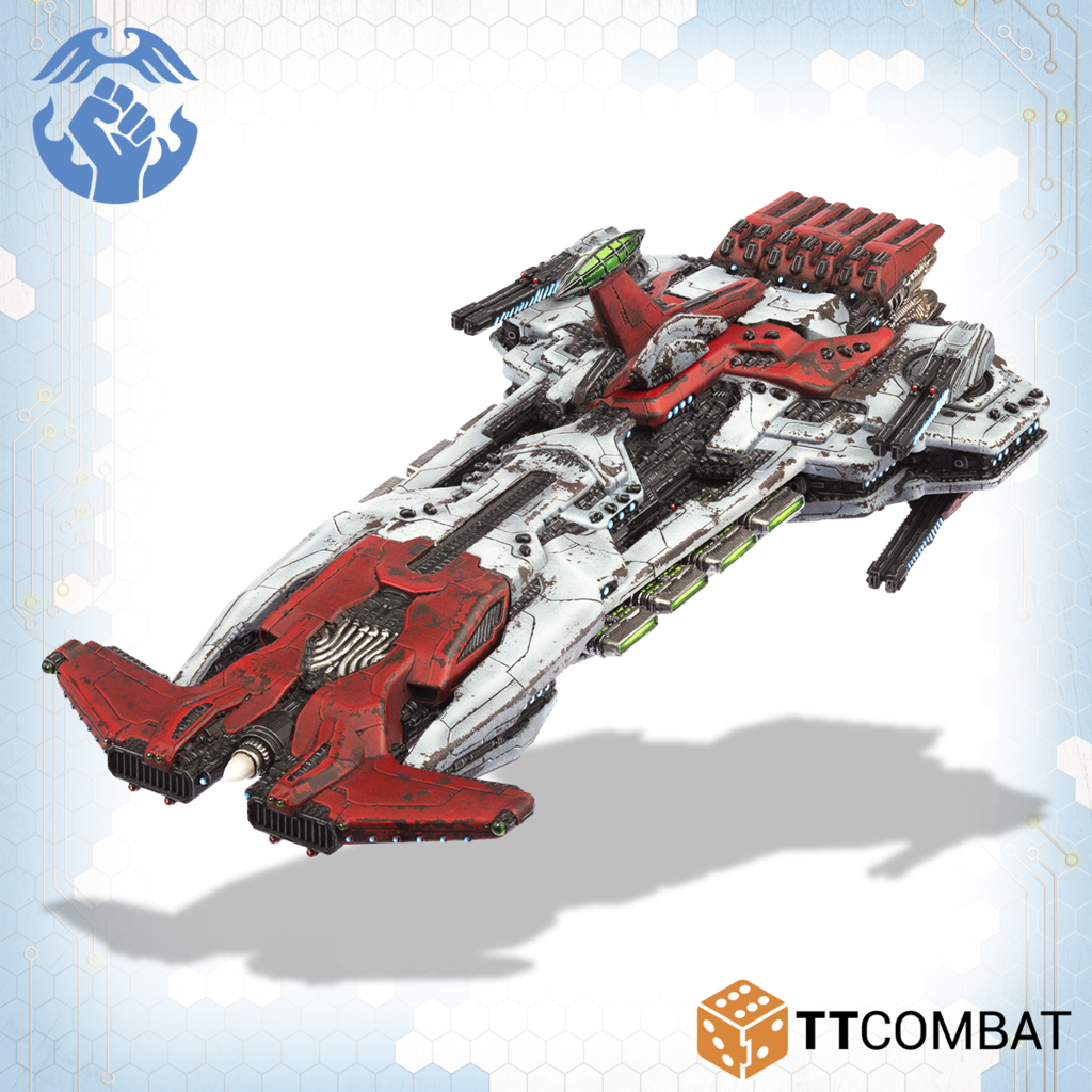 The oldest design was the Trident, produced exclusively in its namesake’s yards by Trident Industrial. It mounts broadsides of the largest chemically fired guns ever built. Though primitive, they have negligible power consumption, making these ships surprisingly flexible in combat. The oldest of these ships had eight more of these mounted on turrets, but were generally refitted with newer Titanmetall 9K twin mass divers long before the Scourge invasion. Topping off this impressive armament is a single torpedo tube with an internal magazine sufficient for four of these ship-killing munitions.