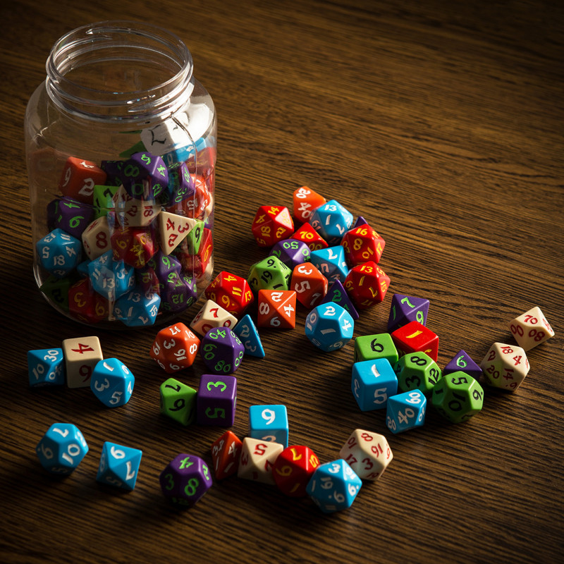Jar of dice with D4, D6, D8, D10, D12, D20, D100 (150). This jar is filled with 80 dice of different designs and colors, of each type.