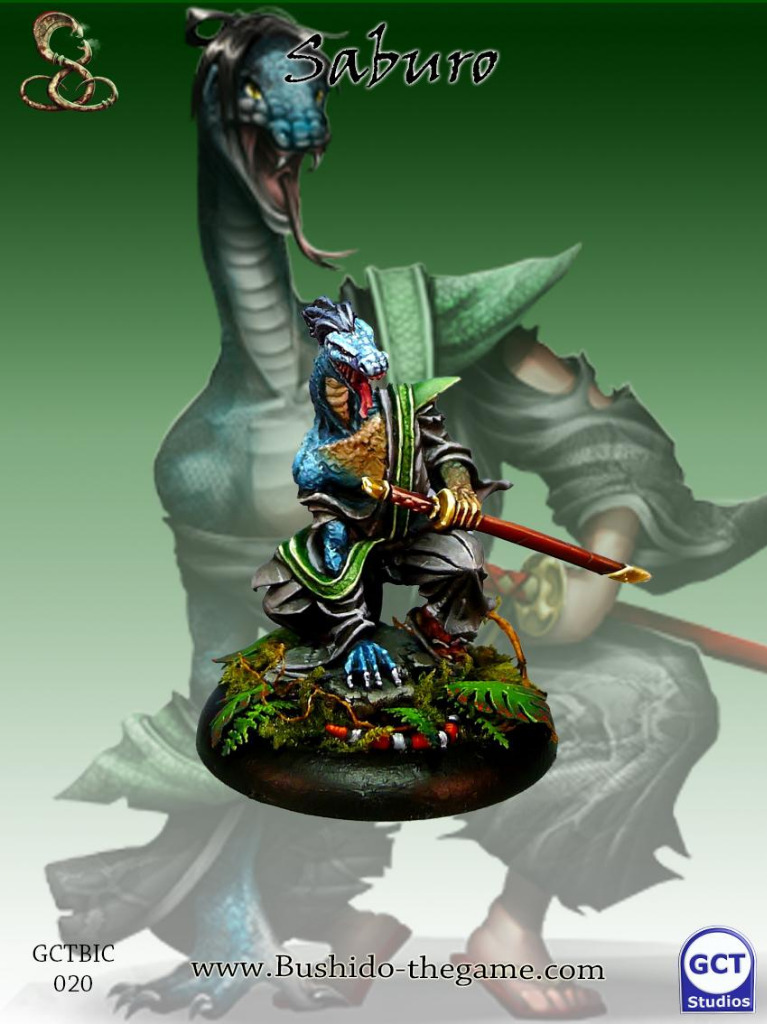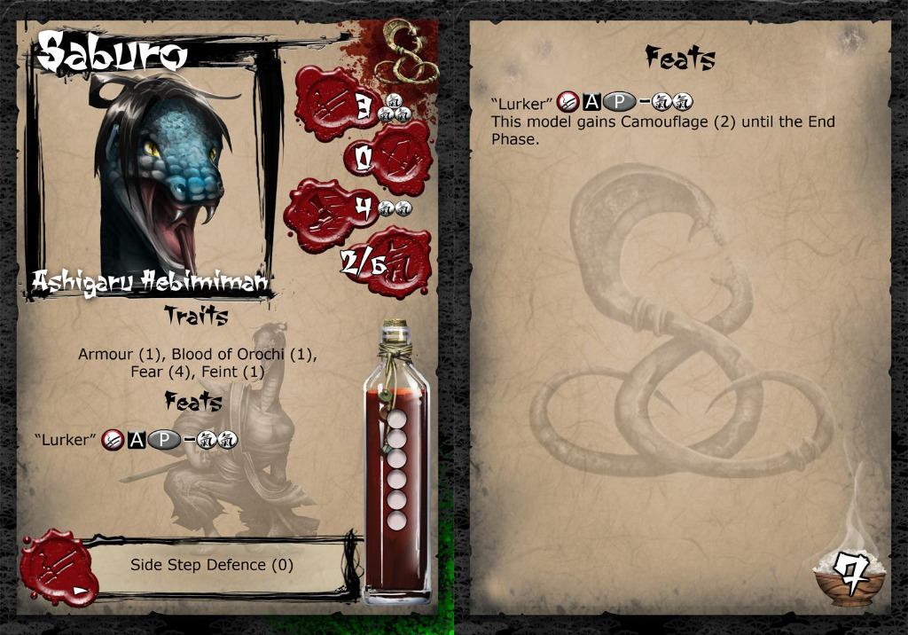 Orochi’s gift presents differently in all her worthy followers, it might be a reflection of an individual’s persona or of Orochi’s intentions for them, subtly crafting the recipient into a tool in the service of their god. If Saburo were a tool it would be a scalpel, fashioned of Minimoto steel. This cool and calm servant of the Ito was once a temple bushi, and as all who demonstrate their devotion was chosen to receive the gift. The physical training that is integral to the training of the Orochi temple bushi was only further enhanced after his transformation into a hebimiman. Now the frightening warrior of the Ito emerges from the shadows to dispatch the enemies of the Ito, disappearing just as fast leaving his foes shocked and with no target for retaliation.