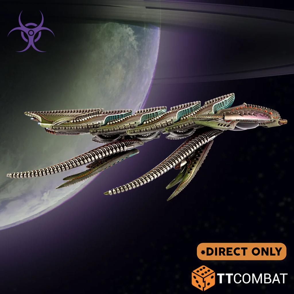 Similar to the Daemon, the Dragon class battleship is a truly ancient behemoth that has weathered the centuries to visit devastation and misery on countless subjugated races. While the Daemon is equipped solely with conventional ship-to-ship weapons, the Dragon includes a pair of cavernous hangar bays, lairs for roosting fighters and bombers. It also carries a pair of enormous Scourge torpedoes – capital ship killing superweapons against which there is little defence save fleeing the Dragon’s inexorable advance.