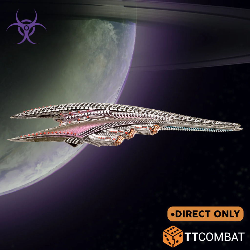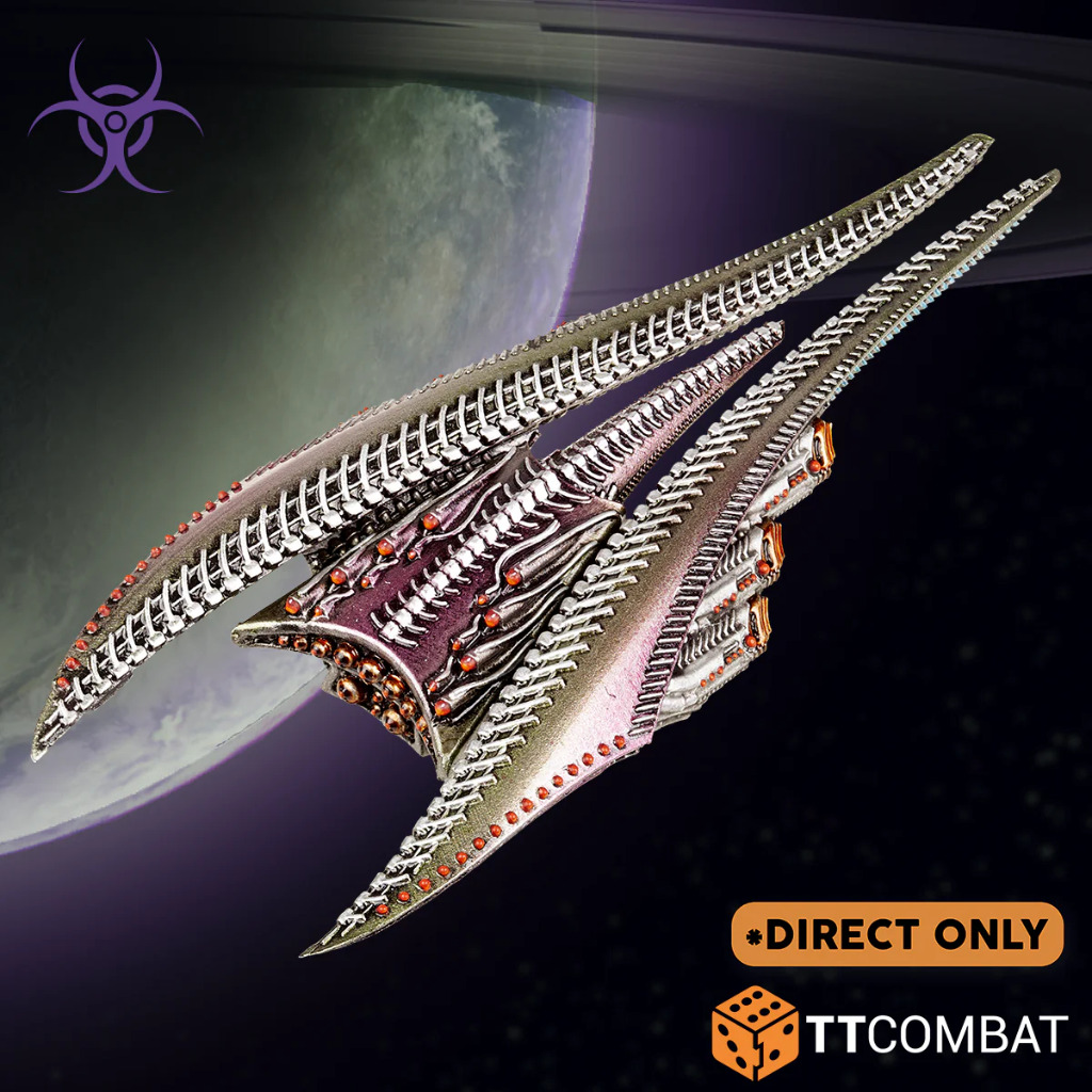 The Wraith Cutter is blisteringly fast, and not too shabby at shooting either! Like most Scourge, you have to get in close to best use it, but with a Thrust of 16″, that won’t be hard. Its Plasma Brand provides the Scourge with a Close Action (Beam) weapon, which turns this from an annoying ship to a potentially terrifying one. The Parasite Radiation Leech is a little weirder! Its Energy Siphon ability feeds on nearby Spikes, both friendly and enemy. The larger Spike you absorb, the more powerful your Occulus Rays will become; a squad of three can put out a potential 27 damage! Although they’ll be lit up like a Christmas tree, so expect some heavy counter-fire if you ever manage to make that happen.