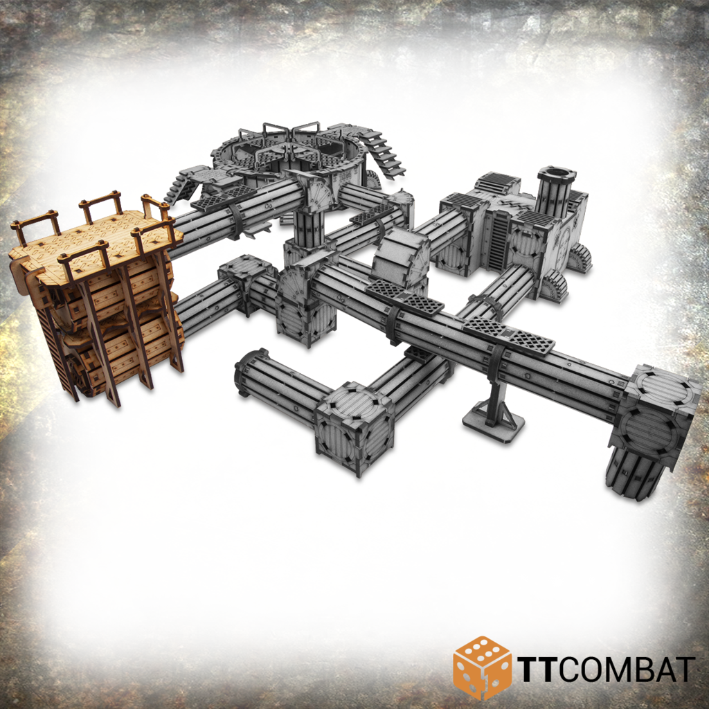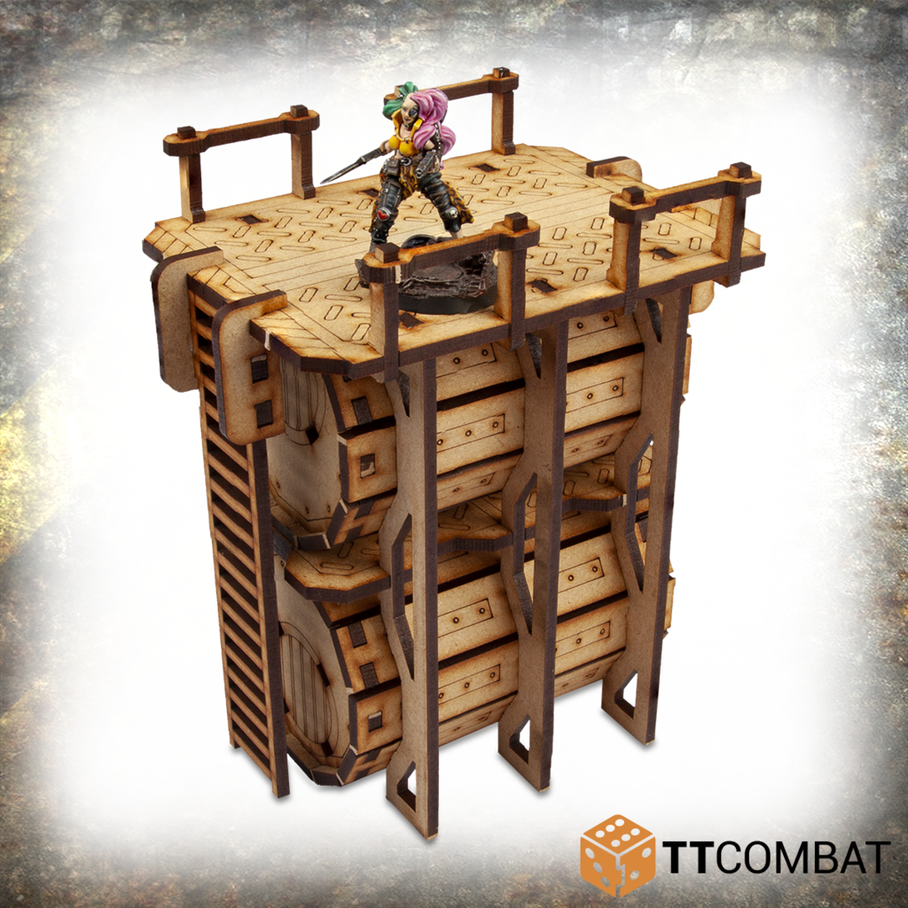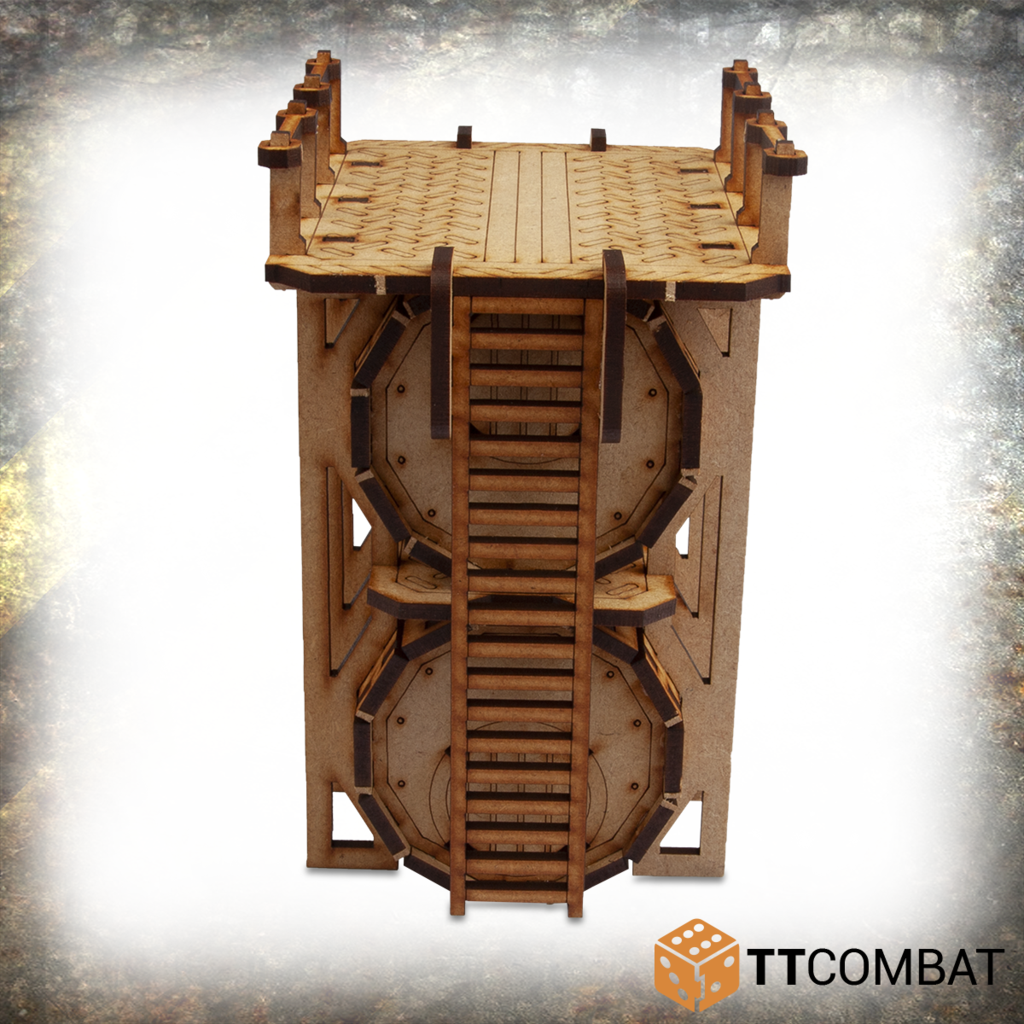 This kit contains the Sector 4 – Storage Tanks. This two-canister storage area can be used as an end cap for your pipe network or a functional building in its own right and is ideal for any futuristic table top game.
