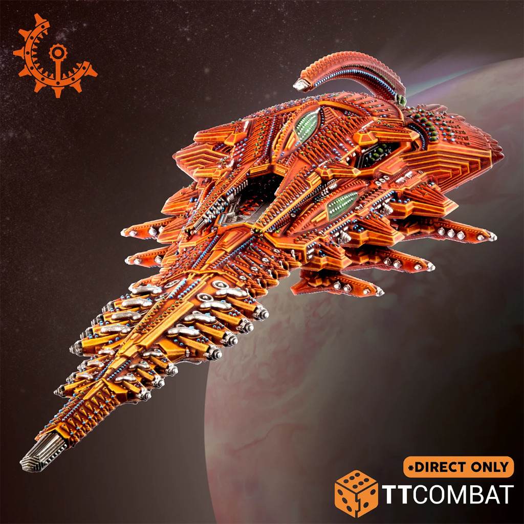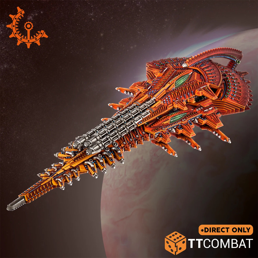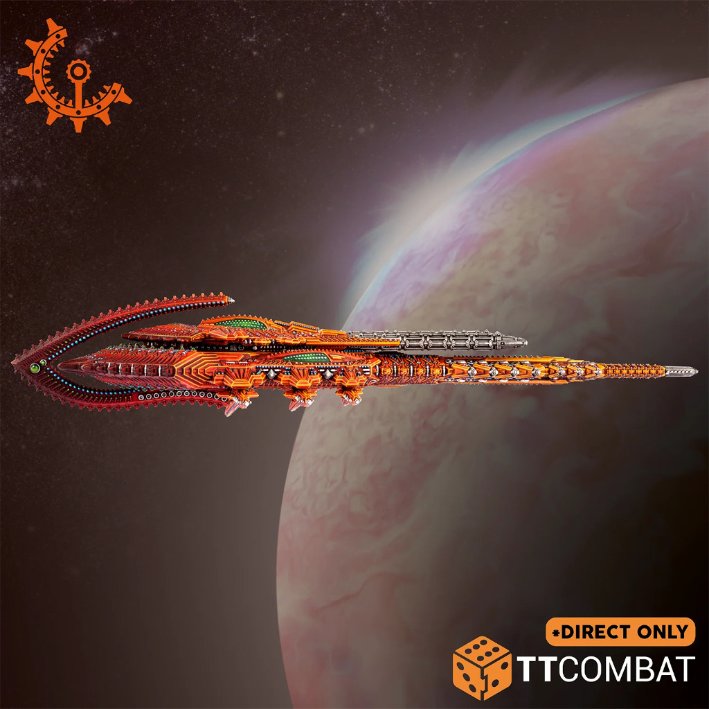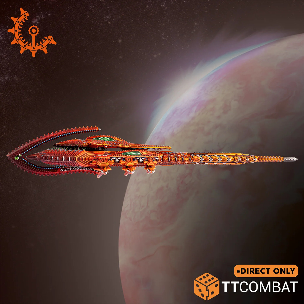The Diamond Class battleship is a truly frightening spectacle. Stretching 1546 meters in length, this mighty vessel is one of the largest known battleships and an imposing figurehead for any fleet. Despite their rarity, more UCMF officers ranking Admiral or above have met their deaths at the hands of one of these leviathans than any other type of ship in the Reconquest. In addition to a pair of disintegrator banks, the Diamond’s primary armament is a triad of super particle lances. These vast weapons extend through half the ship’s entire length and are fixed in the forward arc, such is their unknowable mass. These monstrosities have the ability to scythe through any armour like butter, their beams frequently passing right through a capital ship. While their damage dealing ability is potent, their real strength lies in reliability – the certainty that the enemy will feel the Diamond’s wrath, no matter how well protected it is.
