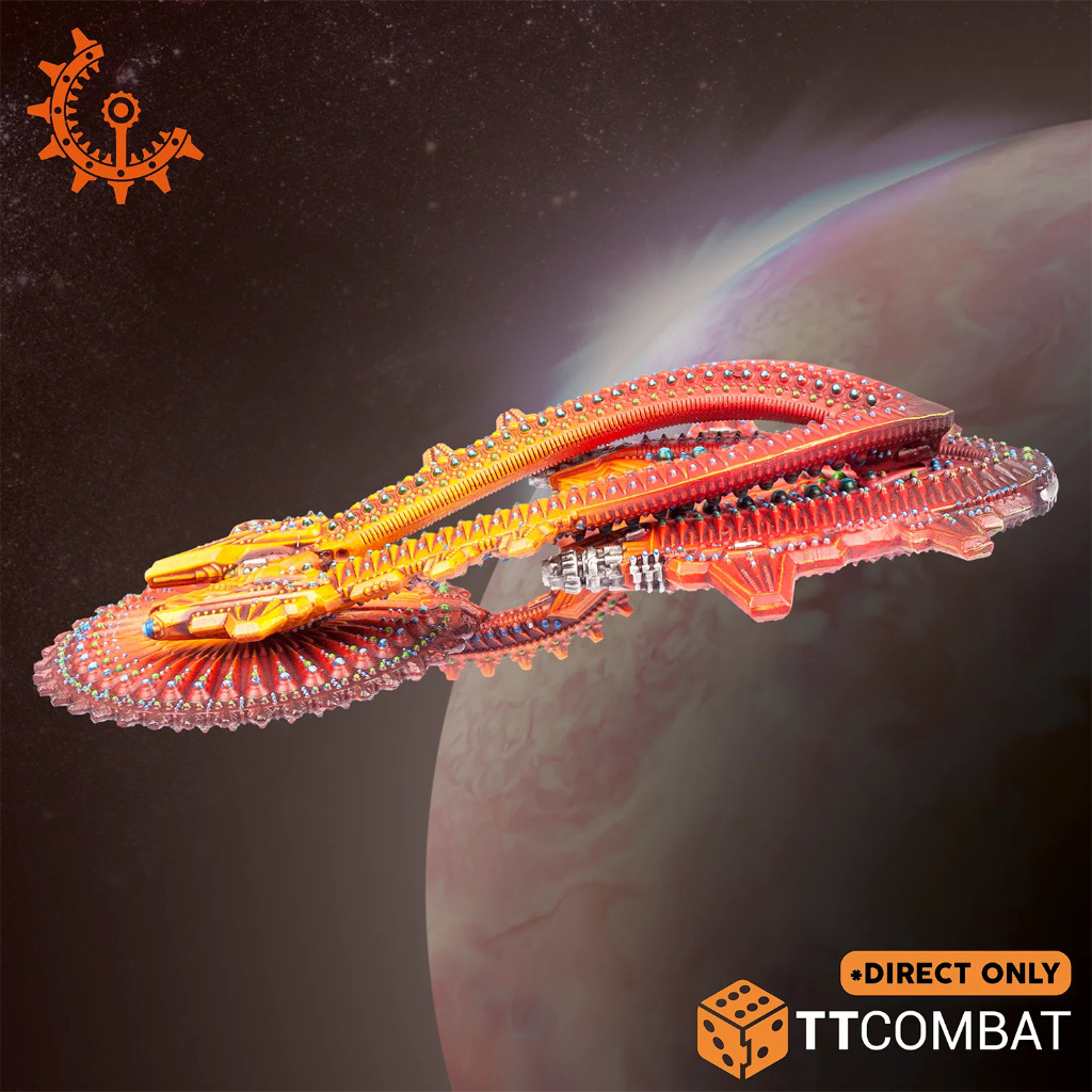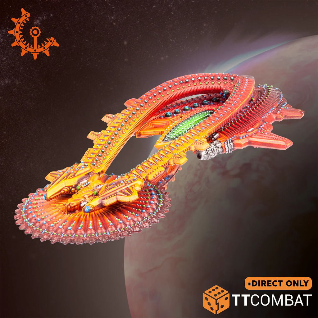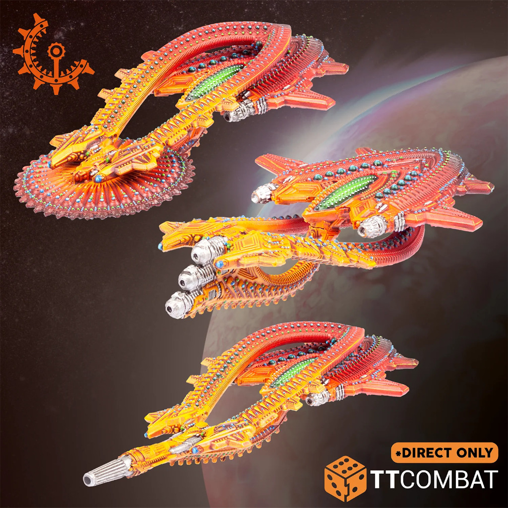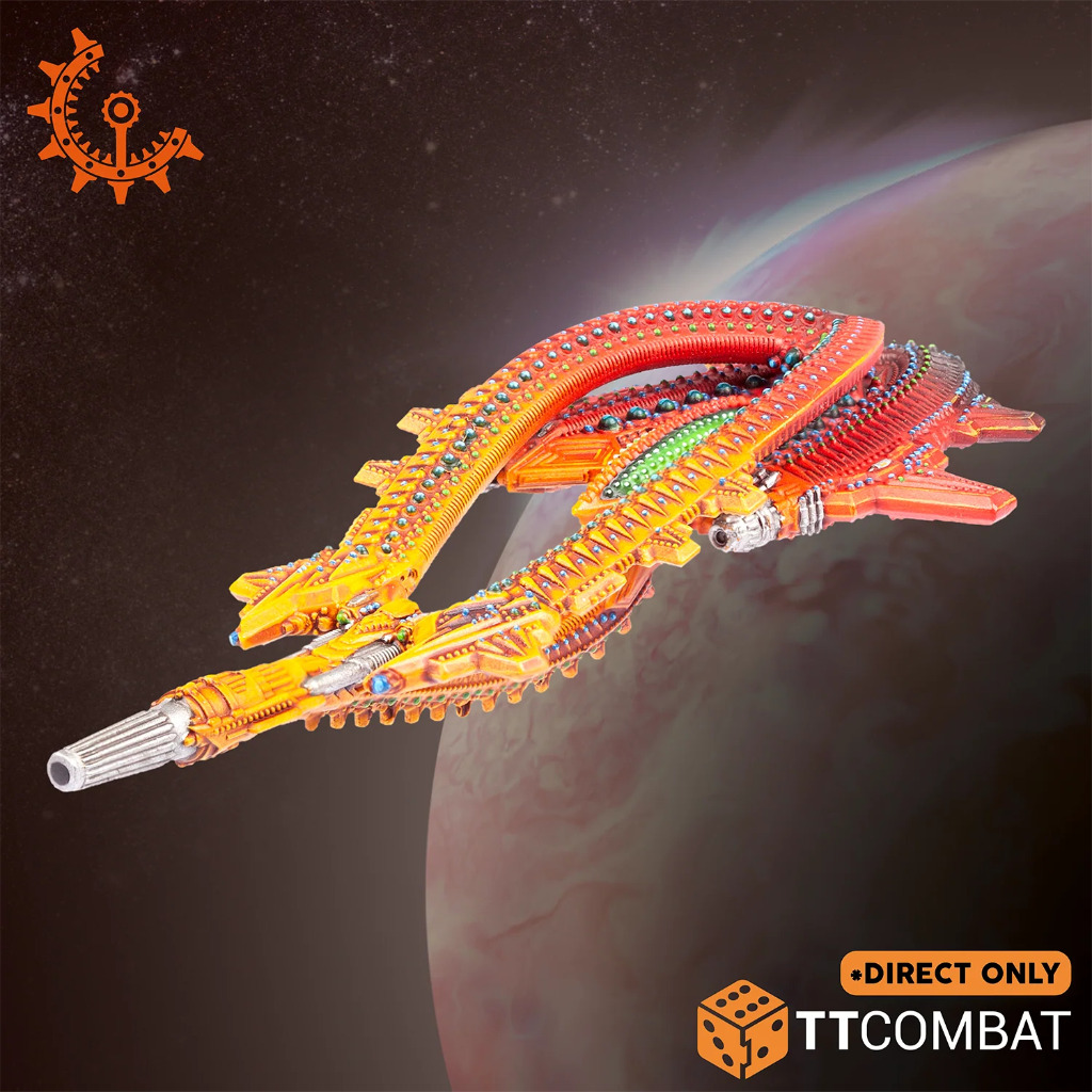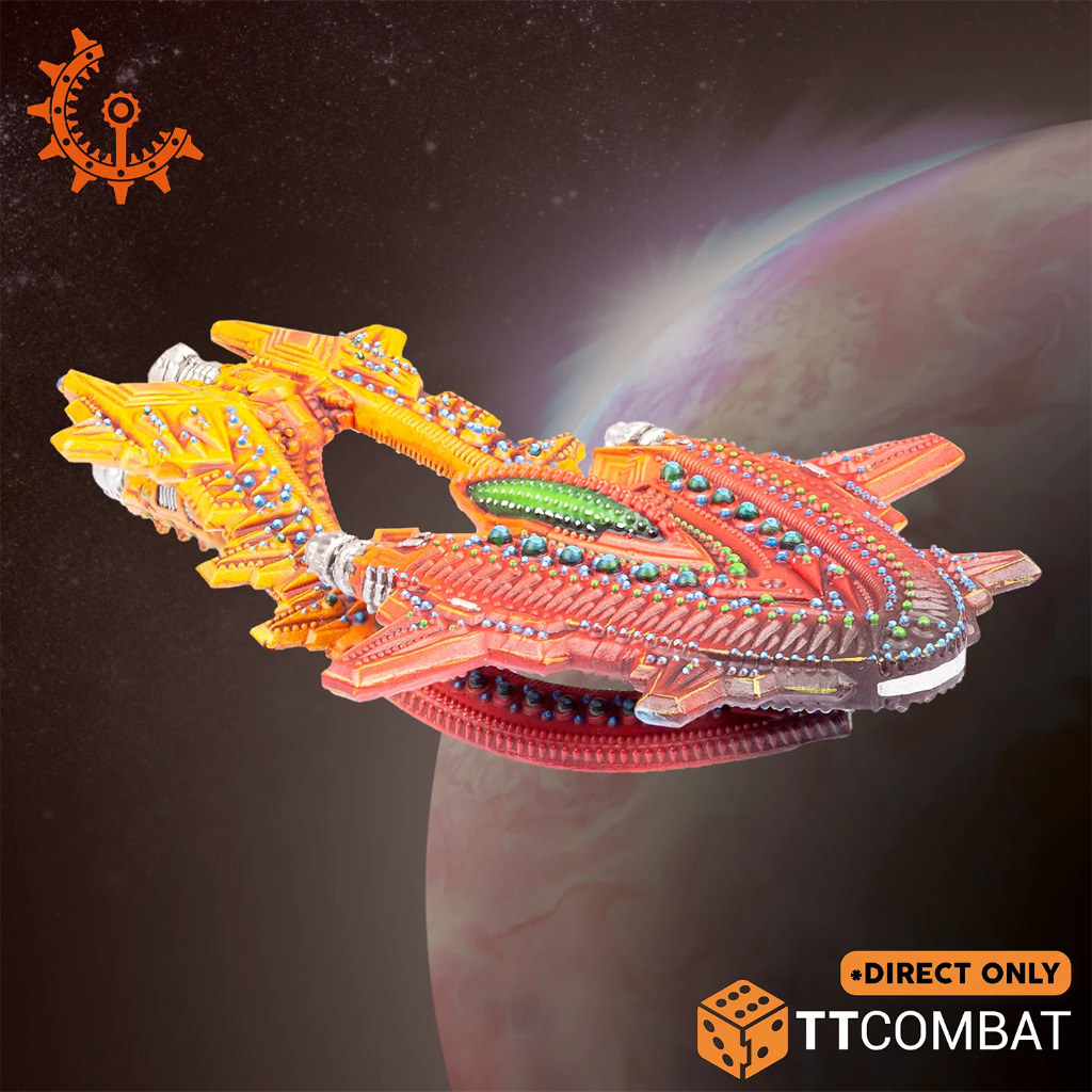 If you like winding arms and strange, fully 3D designs, look no further! The three Destroyers are built in very different ways, making some weird looking ships! The Chromium has a big Burnthrough laser – a rare occurrence for Shaltari. Meanwhile the Mercury is a bit stranger still, its Pulse Ioniser Bank giving a lethal Mauler weapon which rolls to Lock equal to the target’s Armour. Finally the Cobalt trades in much of its offensive weaponry (although not all) for the ability to launch ground assets – it’s a mini-mothership!