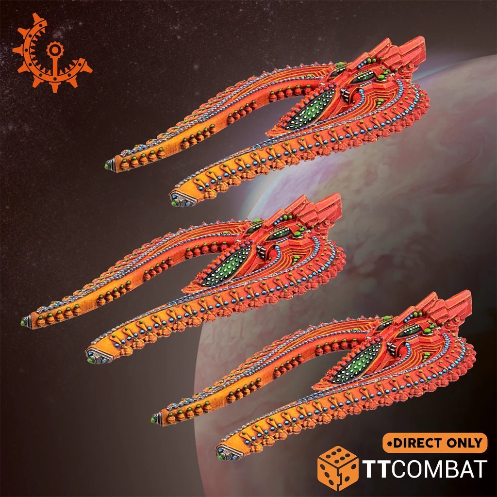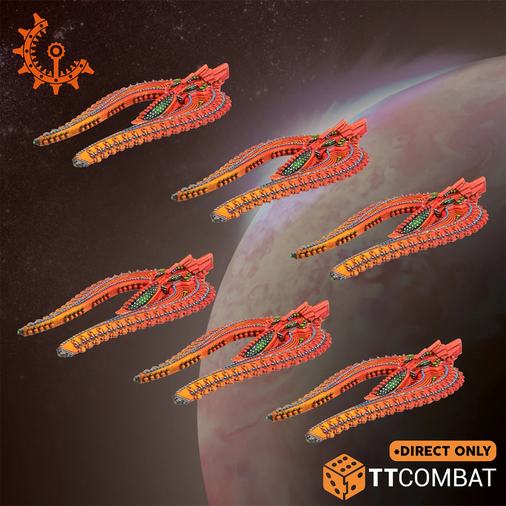 This set contains 6 Shaltari Helium Voidflyers. In a horseshoe design, these ships are covered in the standard Shaltari detail – hope you like painting dots!