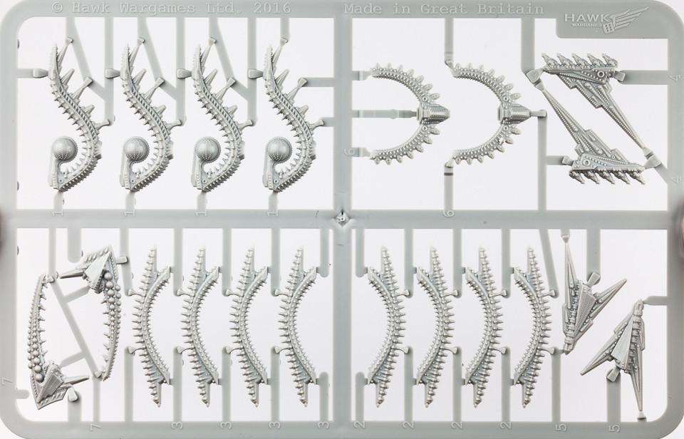 4x Shaltari Frigates: These multi-part hard plastic lavishly detailed 1:9150 (0.2mm) scale miniatures can be assembled as up to four different classes. Typical length 68mm. 20 Parts for all four ships (including optional ones).