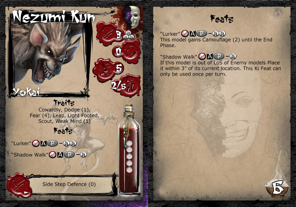 Little is known about the origins of Nezumi Kun, even the scholars of the Blue library could only guess at the occult rituals and black magic used to create this “Son of Nezumi”. The savage Yokai appears more wild and feral than its “father”, striking from nowhere, only a rank stench left to mark its passage before it scuttles away into the darkness. Waiting and lurking in the shadows waiting for instruction from a faceless unseen evil.